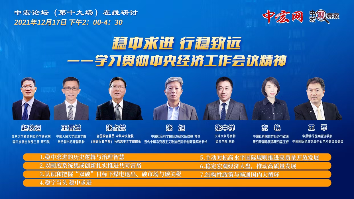 中宏网北京12月17日电 12月17日下午,聚焦“稳中求进 行稳致远——学习贯彻中央经济工作会议精神”主题,中宏论坛第十九场在线研讨将召开。中国社会科学院经济研究所教授、全国马克思列宁主义经济学说史学会副会长张旭,全国政协委员、中共中央党校(国家行政学院)马克思主义学院院长张占斌,天津大学马寅初经济学院院长张中祥,中国人民大学经济学院常务副书记兼副院长王晋斌,中国社会科学院世界经济与政治研究所研究员、国际贸易室主任任东艳,中原银行首席经济学家、中国国际经济交流中心学术委员会委员王军,北京大学新结构经济学研究院研究员、国内发展合作部主任赵秋运等应邀出席论坛并将主题发言。
