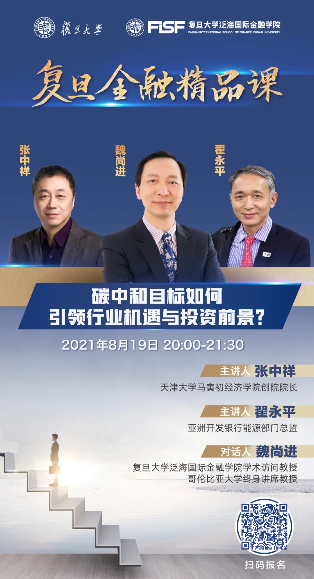 2021年8月19日,天津大学马寅初经济学院创院院长张中祥、亚洲开发银行能源部门总监翟永平将共同走进“复旦金融精品课”,以“碳中和目标如何引领行业机遇与投资前景”为题,与《复旦金融评论》主编、复旦大学泛海国际金融学院学术访问教授、哥伦比亚大学终身讲席教授魏尚进展开深度对话,共话碳中和下的变革与机会,挖掘新兴产业的机遇与挑战。