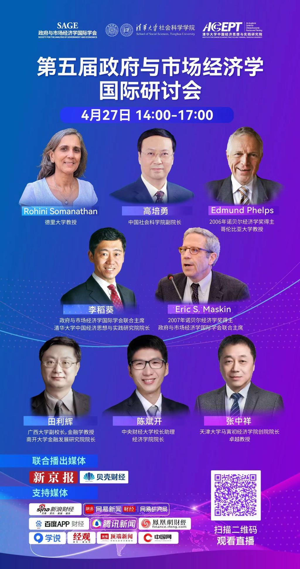 2023年4月27日,由政府与市场经济学国际学会、清华大学中国经济思想与实践研究院和清华大学社会科学学院联合主办第五届政府与市场经济学国际会议。诺贝尔经济学奖获得者、哈佛大学亚当斯讲席教授Eric Maskin,诺贝尔经济学奖获得者、哥伦比亚大学Edmund Phelps教授,中国社会科学院副院长高培勇研究员和印度德里大学Rohini Somanathan教授将做主旨报告。广西大学副校长田利辉教授,天津大学马寅初经济学院创院院长张中祥教授,中央财经大学校长助理、经济学院院长陈斌开教授将参加圆桌讨论,圆桌讨论由政府与市场经济学国际学会联合主席、清华大学中国经济思想与实践研究院院长李稻葵教授主持。