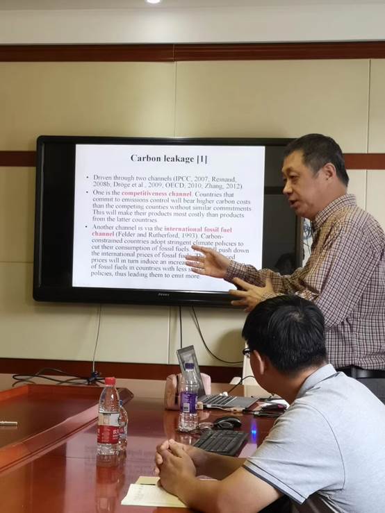 张中祥教授首先简单介绍了在荷兰和美国工作时相关前沿研究工作,随后结合国内相关政策研究方向和国际学术研究前沿,展开关于气候减缓及国际贸易影响的广泛讨论,特别是结合其英文专著《国际贸易与气候变化:聚焦碳泄露、碳排放边境调节和WTO一致性》(“Trade and Climate Change: Focus on Carbon Leakage, Border Carbon Adjustments and WTO Consistency”)等个人研究成果,对国际贸易与气候变化领域碳泄露、碳排放边境调节和WTO一致性等关键议题研究进行了评论和分析。