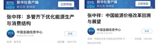 2019年8月15日新华社客户端推送的张中祥的文章“中国能源价格改革回溯与展望”,新华社客户端网站显示阅读量已超过150万。该文是应邀为《中国社会科学报》经济学版撰写的。