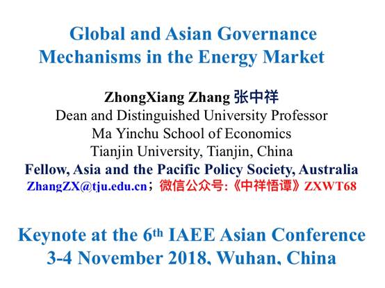 2018年11月2-4日第六届国际能源经济学会(IAEE)亚洲大会在武汉召开。本次大会分别在开幕和闭幕安排了两场大会报告。芬兰阿尔托大学商学院Timo Kuosmanen教授,天津大学马寅初经济学院院长、卓越教授,国家能源、环境和产业经济研究院院长张中祥教授和日本能源经济研究院院长兼首席执行官Masakazu Toyoda应邀在开幕大会上做主旨报告。同时张中祥教授还主持了闭幕大会主旨发言,由国际能源经济学会副理事长Ronald Ripple教授和香港理工大学David Broadstock教授分别做了主旨报告。