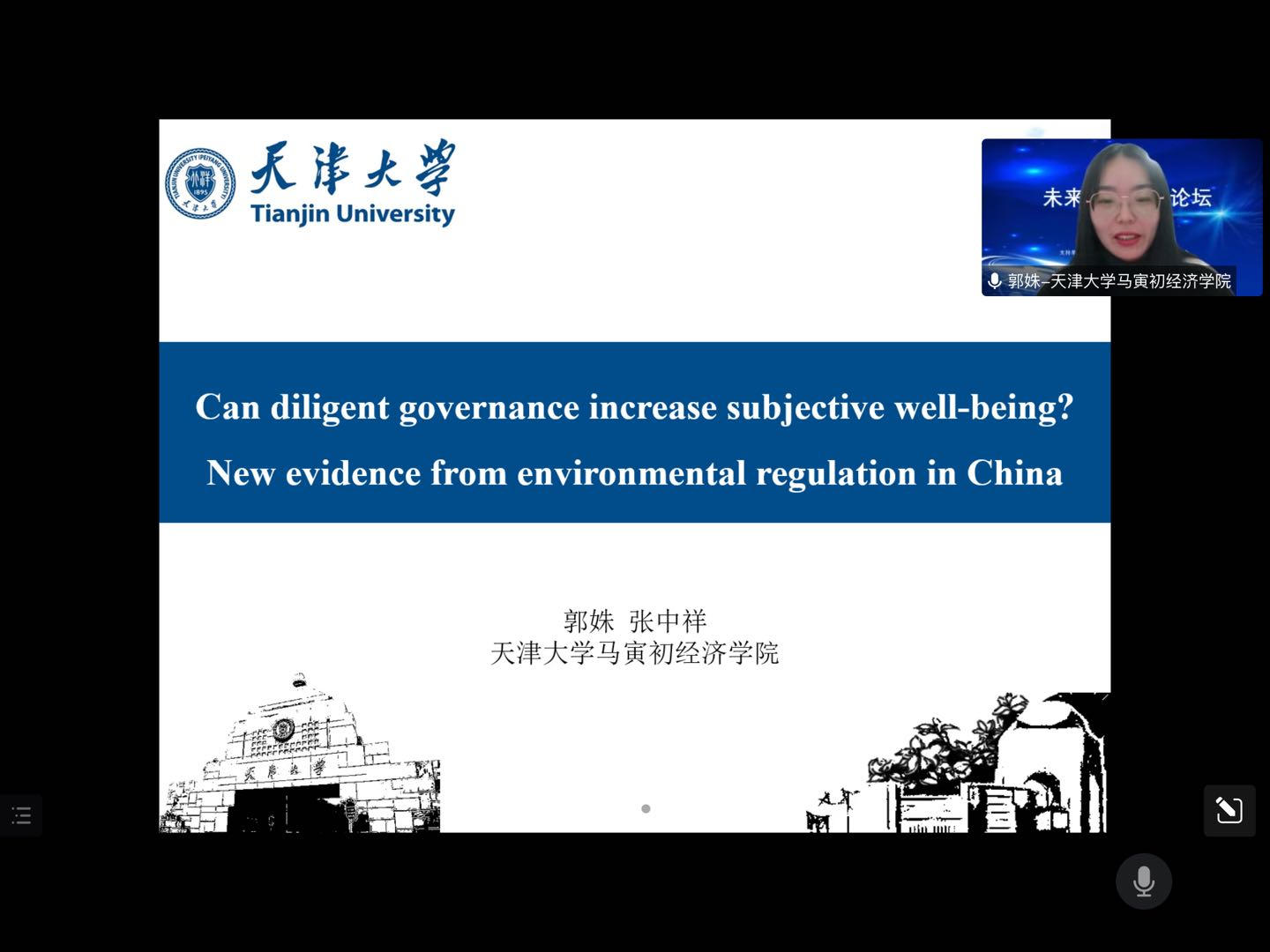 郭姝报告了与导师张中祥教授的合作论文“Can diligent governance increase subjective wellbeing? New evidence from environmental regulations in China”。该研究将宏观数据与中国家庭追踪调查数据匹配形成平衡面板数据,探讨环境规制对主观幸福感的影响及其机制分析。本研究发现环境规制可以显著促进主观幸福感,并且人们的支付意愿为每天10.67元(1.60美元)。环境规制对主观幸福感的促进作用在拥有城市户口群体、受教育程度较高的群体、室内工作者、有小孩的家庭成员和男性中表现得尤为突出。此外,环境规制可以通过促进了人们对地方政府的满意度来提高主观幸福感。本研究进一步表明,只有真正有效的环境规制才能提高国民主观幸福感,而华而不实的环境规制只会产生负面影响。最后,本研究揭示了为了更好地实现“环境-民生”双赢,政府应该继续加强环境治理力度和优化环境规制政策工具。