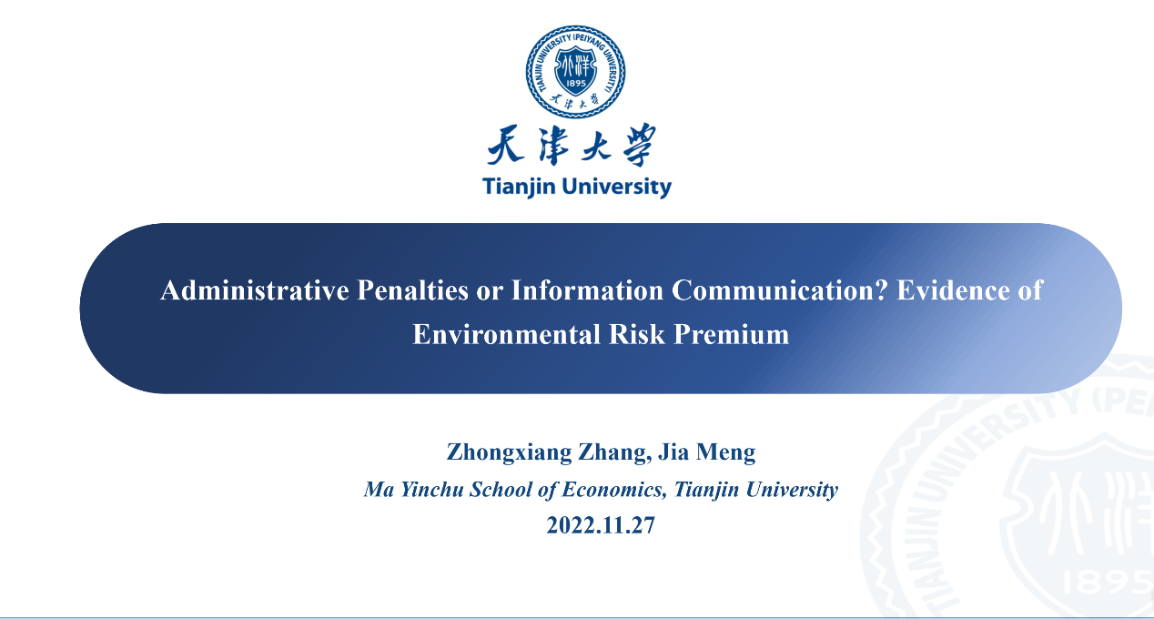 孟佳报告了与导师张中祥教授的合作论文“Administrative Penalties or Information Communication? Evidence of Environmental Risk Premium”。本文以2006-2020年间中国的上市企业为样本,研究环境处罚和环境信息披露是否会在企业间产生不同的风险溢价,并且所产生的风险溢价是否会因投资者参与程度而发生变化。本文另对环境处罚和环境信息披露政策失效或有效的原因或机制进行了分析。研究发现,环境处罚政策并未显著影响企业的风险溢价,这主要是由于中国环境处罚力度较弱,且企业存在较强的政治关联;其次,环境信息披露制度可以显著降低企业的风险溢价,这表明投资者会向未进行环境信息披露的企业索取更高的收益,来补偿其所面临的环境风险;另外,环境信息披露制度对风险溢价的影响会随着投资者参与程度的增加而加大,且环境信息披露制度可以通过降低投资者与企业之间的信息不对称和增加投资者关注度这两个渠道,最终降低企业的风险溢价水平;最后,重污染企业相比非重污染企业能够更好的通过披露环境信息,来降低自身的风险溢价水平。并且,企业声誉在影响环境信息作用的过程中发挥着重要的作用。