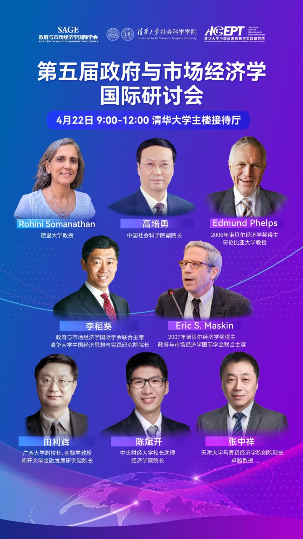在清华大学庆祝建校112周年之际,由政府与市场经济学国际学会、清华大学中国经济思想与实践研究院和清华大学社会科学学院联合主办的第五届政府与市场经济学国际会议于2023年4月22日在清华大学主楼举行。诺贝尔经济学奖获得者、哈佛大学亚当斯讲席教授Eric Maskin,中国社会科学院副院长高培勇研究员,诺贝尔经济学奖获得者、哥伦比亚大学Edmund Phelps教授和印度德里大学Rohini Somanathan教授依次做了主旨报告。随后,广西大学副校长田利辉教授,天津大学马寅初经济学院创院院长张中祥教授,中央财经大学校长助理、经济学院院长陈斌开教授参加了圆桌讨论,圆桌讨论由政府与市场经济学国际学会联合主席、清华大学中国经济思想与实践研究院院长李稻葵教授主持。