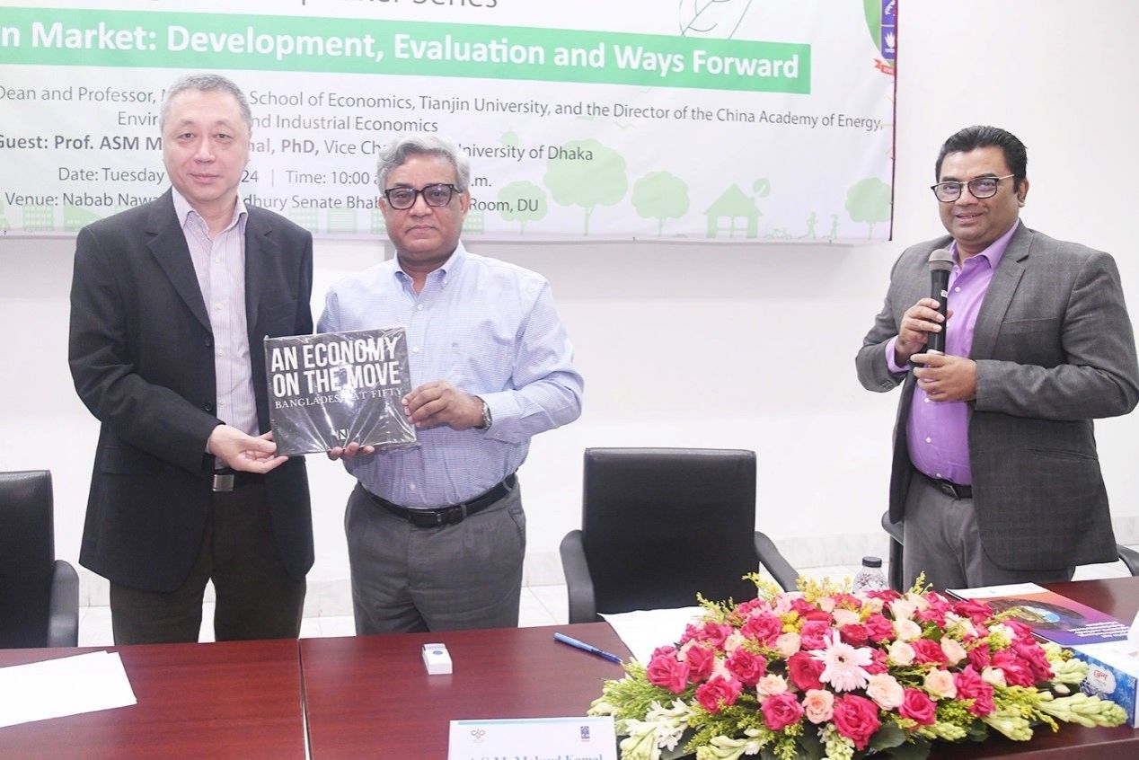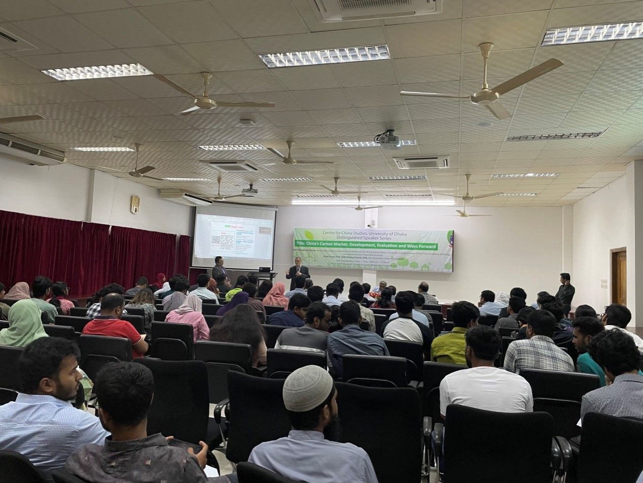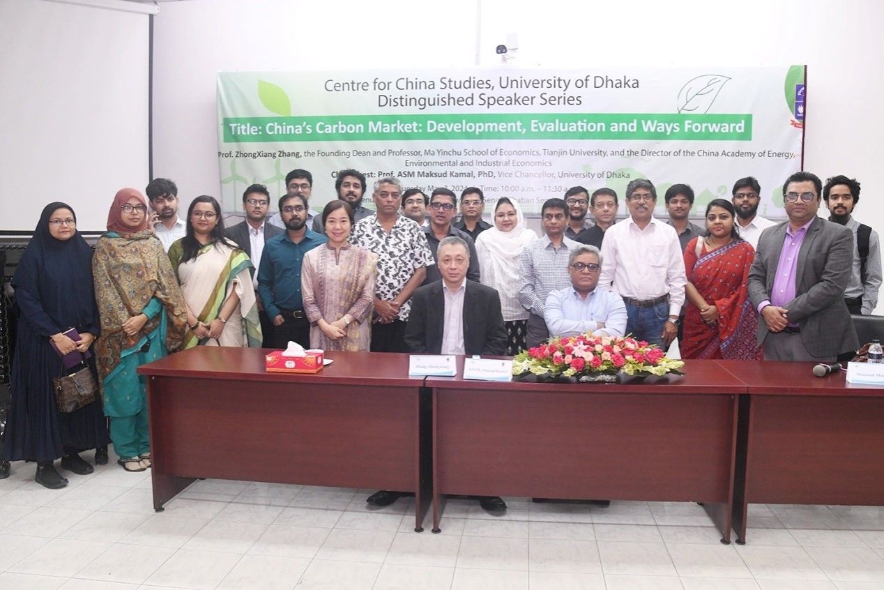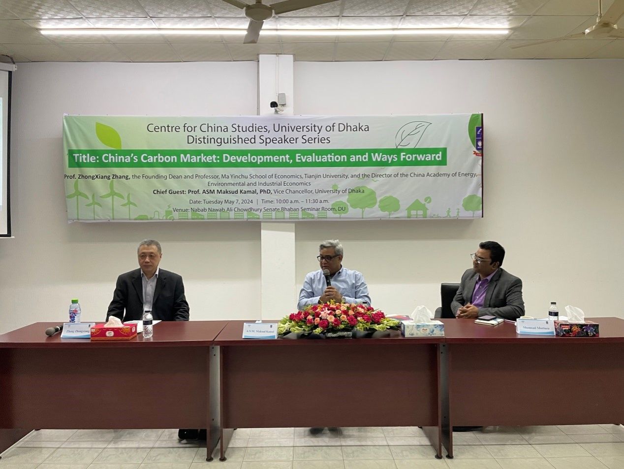 2024年5月7日,天津大学卓越教授、马寅初经济学院创院院长,国家能源、环境和产业经济研究院院长张中祥应邀在达卡大学杰出演讲者系列作了题为“中国国家碳市场:发展、评估和前景”的专题讲座。达卡大学校长Maksud Kamal教授出席讲座并做了点评、赠送介绍孟加拉国独立50年来经济发展的精美画册,达卡大学国际事务办公室主任、中国研究中心(孟加拉国)孟方主任Shamsad Mortuza教授主持报告会,来自达卡大学的100多位师生现场参会并进行积极互动。