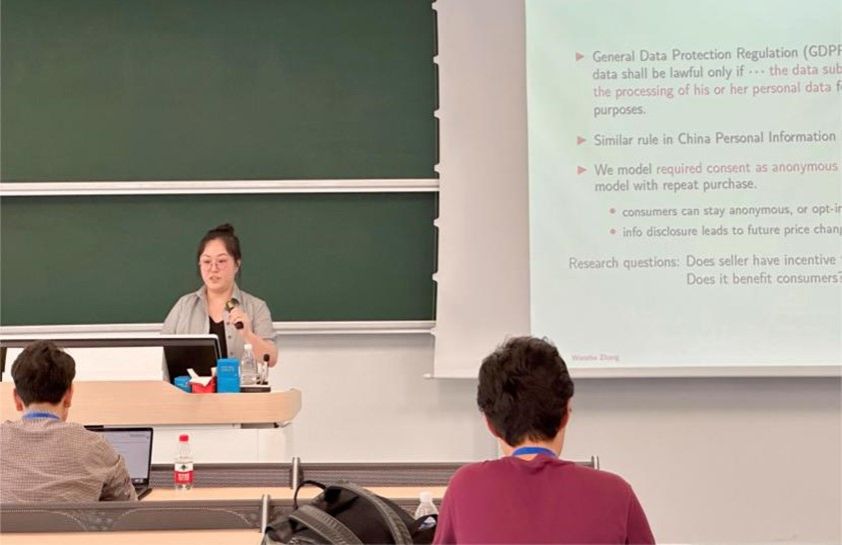 师资博士后张晚烛在分会场报告了论文“The Value of Anonymous Option”。近年来个人数据保护法规通常要求卖家在收集与分析消费者信息之前获得消费者的明确同意。文章通过在经典的买卖重复博弈模型中引入“匿名购买选择”,允许消费者在从卖家购买产品时保持匿名,进而分析数据定价环境下匿名选择对博弈均衡的影响及其福利效应。尽管信息搜集与个性化定价意味着企业在消费者重复购买时可以最大程度的攫取消费者剩余,但卖家通过向消费者提供匿名选择会间接提高其市场承诺能力进而提高利润。这是因为卖家能够间接承诺对未识别的消费者设定较高的新客价格,从而避免消费者在第一期策略性地延迟消费。相比之下,由于平均价格上涨的同时需求下降,消费者福利反而下降。因此,强制要求卖家提供匿名购买选项的隐私法规实际上可能无法保护消费者的福利。