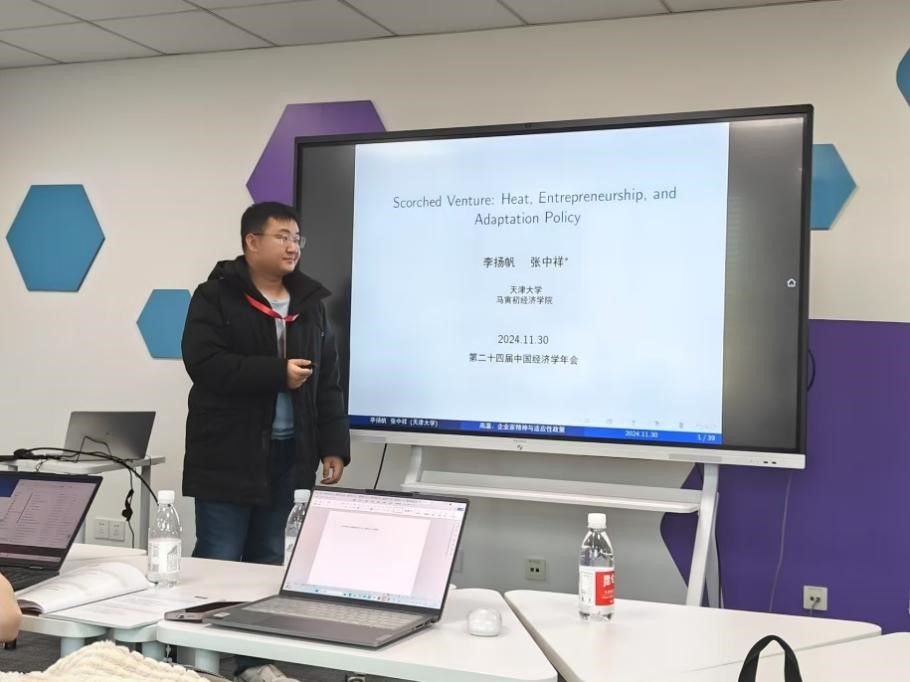 博士生李扬帆在发展经济学分会场报告了与导师、天津大学马寅初经济学院创院院长张中祥教授的合作论文“Scorched Venture: Heat, Entrepreneurship, and Adaptation Policy”。随着全球气候变暖,高温的负面影响愈来愈得到广泛关注。他们研究了热暴露对创业活动的影响,并检验了特定气候适应政策的有效性。利用企业注册数据和县域温度波动,研究发现高温抑制了创业活动。与温度在13-18摄氏度之间相比,温度高于29摄氏度的额外一天会导致创业活动下降0.48%。潜在机制是源于热暴露伤害了个体的创业能力,加剧了流动性约束,并降低了创业活动的预期收益。他们发现更好地银行信贷可得性似乎可以减轻高温的不利影响。利用BD-DID设计,他们研究发现中国的气候适应城市计划有效地缓解了高温对创业的损害。本文的发现扩展了气候变化对社会经济影响的理解,并强调了相关适应策略的重要性,特别是对于更容易受到气候风险影响的发展中国家。