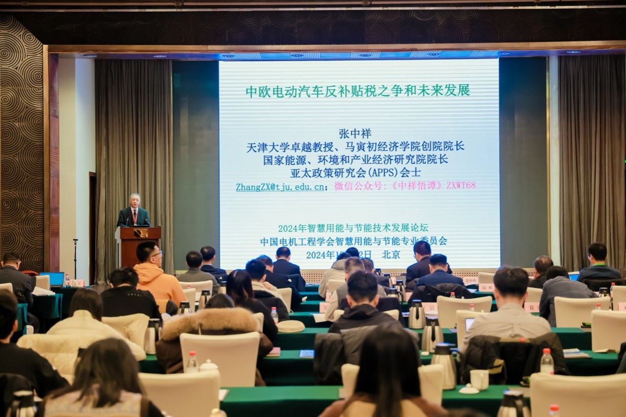 中国电机工程学会智慧用能与节能专委会主办的2024年智慧用能与节能技术发展论坛于12月11-12日在北京举行。中国电机工程学会副秘书长崔炜和专委会主任委员、中国工程院院士王成山致辞。天津大学卓越教授、马寅初经济学院创院院长,国家能源、环境和产业经济研究院院长张中祥以“中欧电动汽车反补贴税之争和未来发展”为题作了大会主旨报告,报告由专委会副主任委员、国网能源研究院有限公司副总经理单葆国主持。