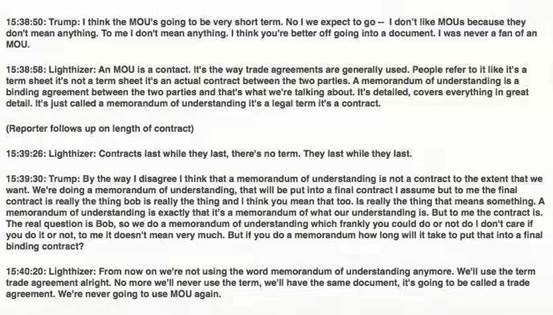 据报道,特朗普总统在会见刘鹤副总理时现场与美国贸易代表莱特希泽(Lighthizer)就MOU发生了不同意见:MOU是不是Contract?特朗普总统认为不是,最后贸易代表说不用MOU一词了,改用trade agreement。