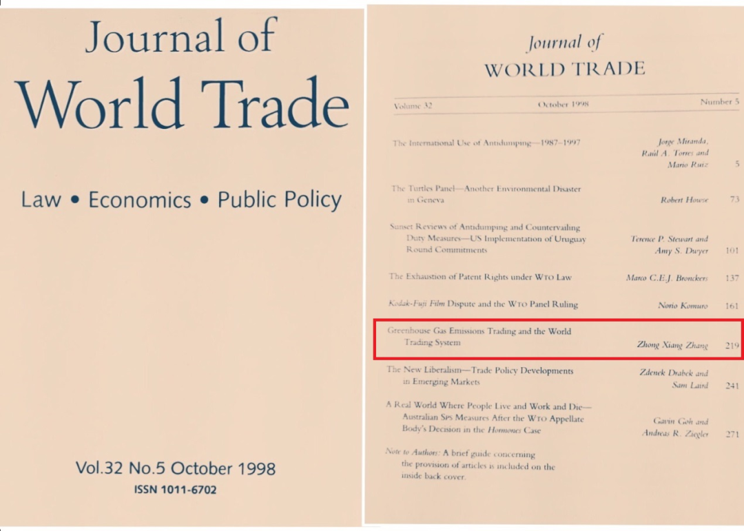 张中祥从上世纪90年代在荷兰格罗宁根大学法学院和经济学院任职时起就呼吁在全球实施碳排放交易这一市场机制。早在1998年,他就与美国环境和资源经济学家协会理事长TomTietenberg教授等欧美学者应邀为联合国贸发会议(UNCTAD)撰写、1999年由联合国正式出版的《温室气体排放交易国际规则》的报告,1998年美国未来资源研究所(RFF)曾以EmissionsTrading101对这个联合国报告做过报道;他在法学和经济学国际杂志JournalofWorldTrade上发表了全球该领域第一篇论述温室气体排放交易和世界贸易的论文;在美国东西方中心任职资深研究员时,张中祥应邀与包括已故PeterBohm(斯德哥尔摩大学经济学教授、1985年Elsevier出版的著名Handbook丛书作者),WallaceOates(美国国家科学院院士、世界顶级公共财政和环境经济学家)和DavidPearce(首位欧洲环境和资源经济学家学会终身成就奖获得者,为张中祥1997年由英国EdwardElgar出版、入选“环境经济学里程碑”丛书的英文独著的封面写了荐言)在内的其他5位欧美顶级经济学家对欧盟碳排放交易体系提出改进建议。