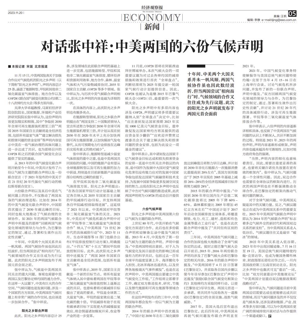 天津大学卓越教授、马寅初经济学院创院院长,国家能源、环境和产业经济研究院院长张中祥认为,这份声明内容更加翔实和细致,其中“争取到2030年全球可再生能源装机增至三倍”“两国2035年国家自主贡献将是全经济范围,包括所有温室气体”“建立解决损失和损害问题的资金安排”等声明内容显示中美在一些气候治理的具体问题上进一步达成了共识,也为即将召开的COP28和之后的联合国气候变化会议提供了坚实的基础。
