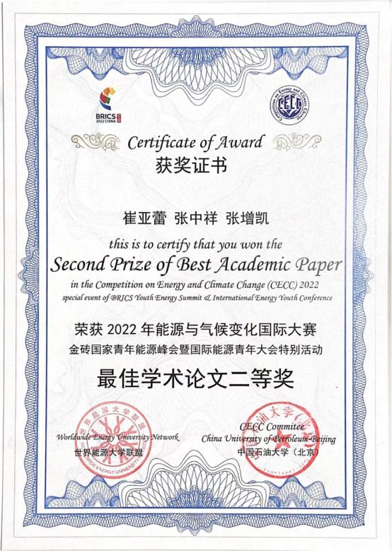 本站讯 由世界能源大学联盟和中国石油大学(北京)主办的2022年能源与气候变化国际大赛于2022年9月18日在北京落下帷幕。经过初赛和决赛,天津大学马寅初经济学院创院院长、卓越教授张中祥指导的博士研究生崔亚蕾的论文“Unequal age-based household carbonfootprintin China”荣获2022年能源与气候变化国际大赛——金砖国家青年能源峰会暨国际能源青年大会特别活动最佳学术论文二等奖。