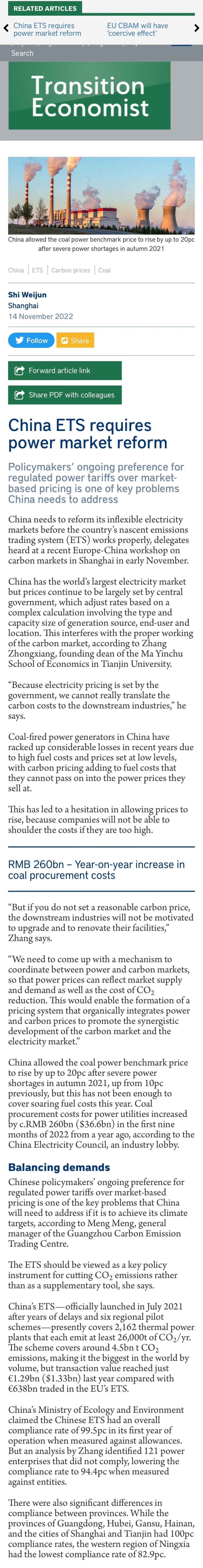 报道来源:https://www.pemedianetwork.com/transition-economist/articles/trading-markets/2022/china-ets-requires-power-market-reform/