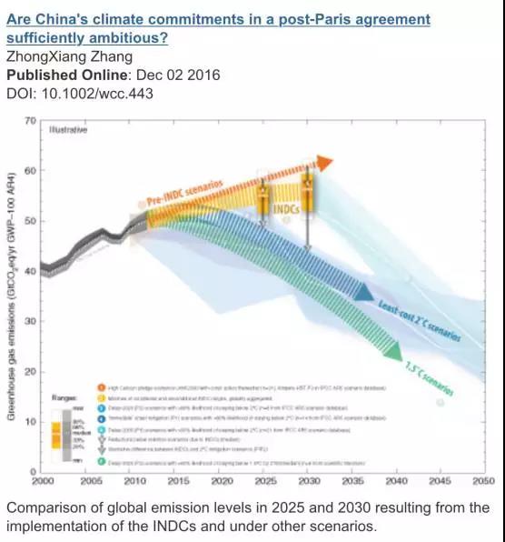 2017年发表在Wiley Interdisciplinary Reviews: Climate Change卷8第二期上的 Are China’s climate commitments in a post--Paris agreement sufficiently ambitious?文章(A4 10页),讨论了从1997年日本京都以来气候变化国际谈判主要议题、分歧点演变及其中国从京都到巴黎、巴黎峰会间和后巴黎时代的立场和角色。指出在气候谈判中中国逐步从一开始的边缘配角向中心主角转变,中国对巴黎峰会已做的贡献和为促使巴黎大会达成有雄心、有力度和全面均衡的协议,在减排长期目标、资金、透明度、盘点机制等诸多关键问题上,在体现中国承诺的严肃性和维护发展中国家利益的同时展现灵活性和做出的让步。文章也讨论了后巴黎时代全球和中国的重点以及中国的承诺是否足够严厉等议题,这些都将影响后巴黎时代后续气候变化国际谈判的结果和能否实现把温升控制在2度以下的理想目标。