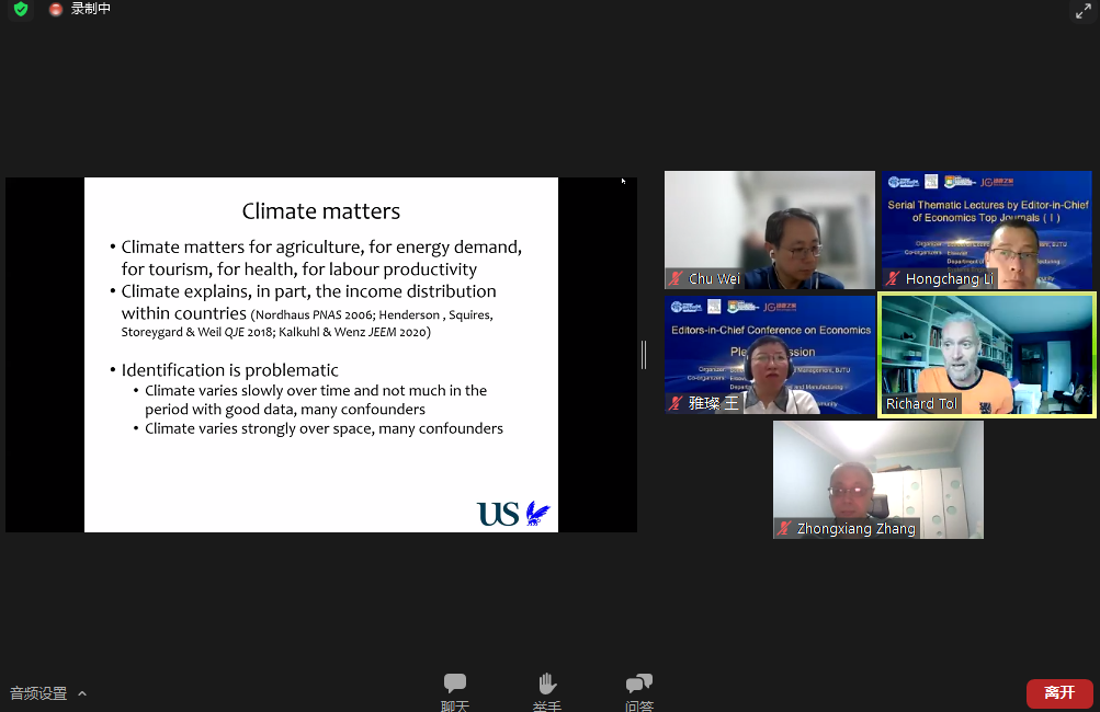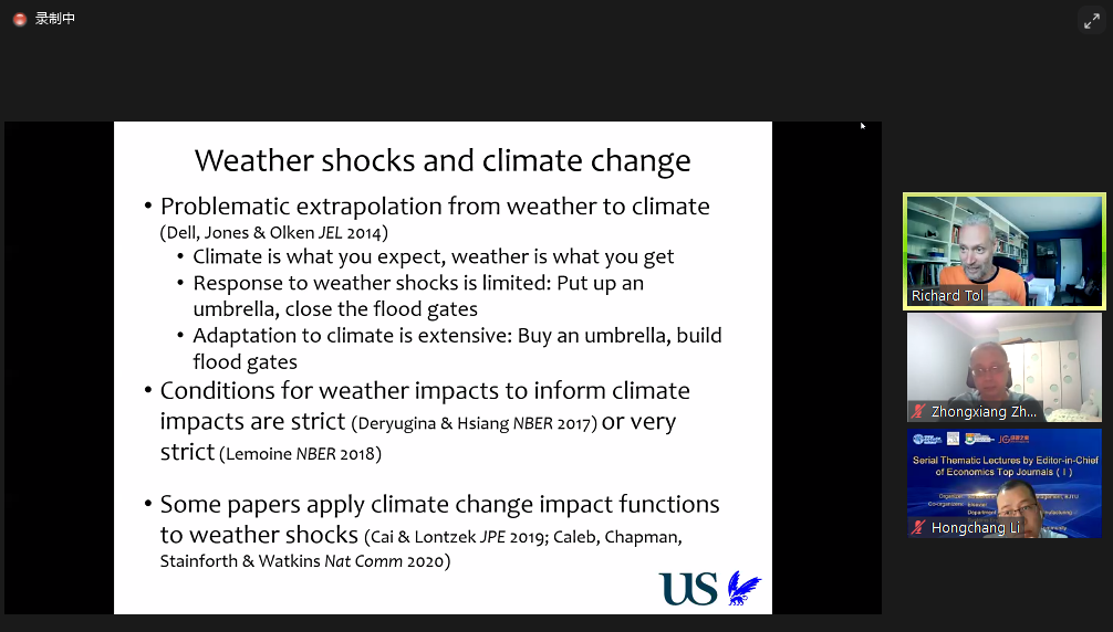 2021年6月12日北京时间20:00至22:30,能源经济学顶刊Energy Economics主编、英国萨塞克斯大学(University of Sussex)经济系Richard S.J. Tol MAE教授线上作了题为The Economic Impact of Weather and Climate的学术报告。该报告是经济学顶级期刊主编系列专题讲座的第一场,由北京交通大学经济管理学院主办,爱思唯尔集团、香港大学工业及制造系统工程系和经管之家论坛协办,通过ZOOM在线会议、哔哩哔哩、经管云课堂在线直播。会议由北京交通大学经济管理学院李红昌教授主持,特邀天津大学马寅初经济学院创院院长张中祥教授、中国人民大学应用经济学院副院长魏楚教授为点评嘉宾。会议吸引了超过1300位观众在线参与。