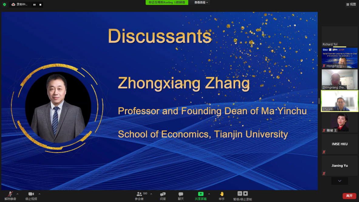 随后,天津大学马寅初经济学院创院院长张中祥教授、中国人民大学应用经济学院副院长魏楚教授分别进行了点评。张中祥教授认为,Richard S.J. Tol MAE教授同时考虑了气候与天气对经济活动的影响,得到了气候影响生产可能性、天气冲击有带来损失的潜在可能性这些重要洞见;同时,他运用随机前沿分析对1950至2014年间160个国家的样本数据进行了分析,给出了很有价值的结论。该文所做的稳健性检验深入细致,不过,模型本身可能存在内生性问题,可能需要进一步考虑其它变量;对极端天气有助于减少非效率这样重要的研究发现也需要更令人信服的解释。另外,在如此长时间跨度里,需考虑国家的贫富状态发生变化将如何影响既有分析。张教授最后与Tol教授讨论了如何解决全球应对气候变化在收益成本框架下,不同发展水平的国家因为不同碳社会成本从而对气候变化影响重视程度和应对力度不同这一最棘手的问题。
