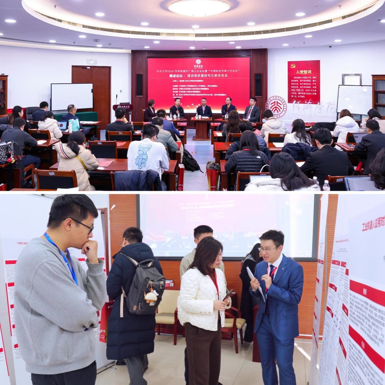 12月14日下午,北京大学2024“学科质量年”博士生论坛暨“中国经济学博士生论坛”开幕式在经济学院101会议室同步举行。董志勇致欢迎辞,锁凌燕主持“建设高质量研究生教育体系”圆桌论坛。中央财经大学党委研究生工作部部长、研究生院院长白彦峰,中国社会科学院大学应用经济学院副院长陈洪波,中央民族大学经济学院副院长吴本健,张辉等嘉宾分享了精彩观点。此次博士生论坛设置海报展示环节,经初审,共有71篇论文入选海报展示。专家学者们为自己认可的研究贴上笑脸贴纸以表肯定,现场讨论氛围热烈。三场平行分论坛于12月15日上午同步举行,12位博士生进行研究汇报,10位专家学者参与点评、打分。基于初审结果和评委们的投票或打分,论坛评选出赵润豪、邓泽霖、李佶冬三位博士生获得“最佳论文汇报奖”,刘晓敏、李紫繁、谭文心、汪雅洁、王漫玉、黄京磊六位博士生获得“最佳海报展示奖”,并在闭幕式上进行了颁奖。