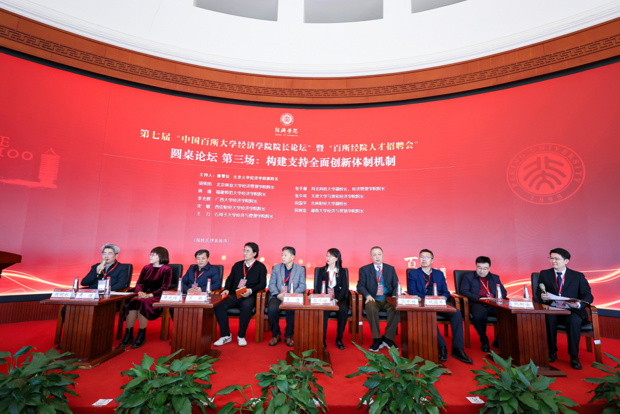 “构建支持全面创新体制机制”圆桌论坛由北京大学经济学院副院长秦雪征主持。北京林业大学经济管理学院院长胡明形,福建师范大学经济学院院长黄瑾,广西大学经济学院院长李光辉,西安财经大学经济学院院长宋敏,石河子大学经济与管理学院院长王力,河北科技大学副校长、经济管理学院院长张冬丽,天津大学马寅初经济学院院长张中祥,吉林财经大学副校长祝国平,湖南大学经济与贸易学院院长祝树金等嘉宾展开了热烈讨论。