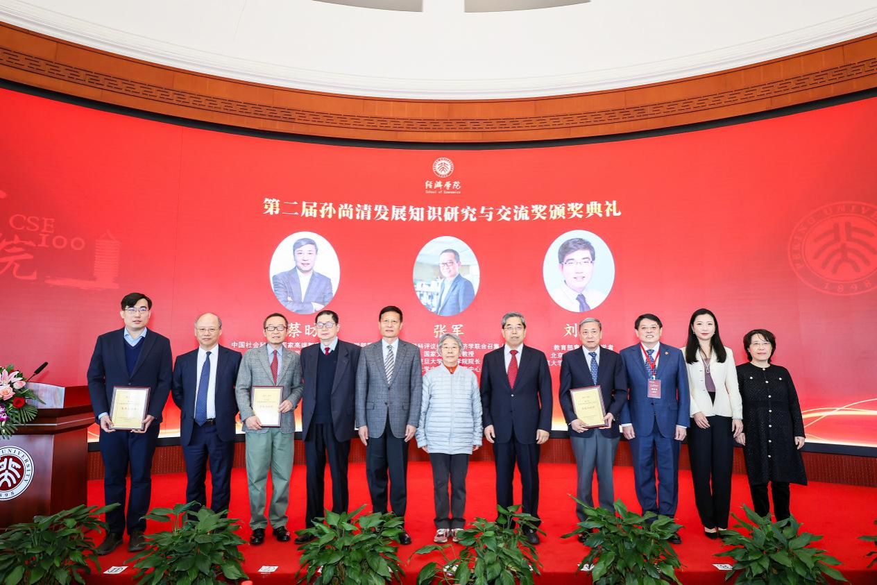 马建堂宣读获奖名单与颁奖词,“第一届孙尚清发展知识研究与交流卓越成就奖”授予蔡昉,“第二届孙尚清发展知识研究与交流卓越成就奖”授予国务院学科评议组理论经济学联席召集人、国家文科一级教授、复旦大学经济学院院长、复旦大学中国经济研究中心主任张军,“第二届孙尚清发展知识研究与交流青年学者奖”授予教育部青年长江学者、北京大学博雅青年学者、北京大学经济学院财政学系主任刘冲长聘副教授。谢伏瞻、董志勇、李克穆分别为三位获奖者颁奖,尹淑琴与张瑾、王艳等嘉宾上台见证并合影。三位获奖者对组委会表达了真诚感谢,并表示将传承前辈精神力量,形成以时代为观照、以问题为导向的理论创新成果,提升国际传播力。颁奖仪式环节由中国社会科学院学部委员、中国社会科学院大学应用经济学院院长杨开忠主持。
