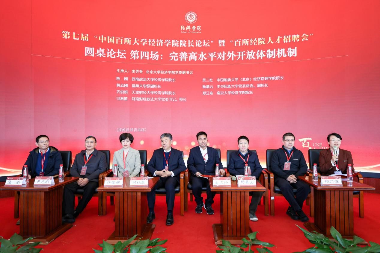 “完善高水平对外开放体制机制”圆桌论坛由北京大学经济学院党委副书记宋芳秀主持。西南政法大学经济学院院长陈刚,福州大学原副校长黄志刚,天津财经大学经济学院院长齐俊妍,河南财经政法大学党委书记、校长司林胜,中国地质大学(北京)经济管理学院院长吴三忙,中央民族大学党委常委、副校长杨慕云,南京大学经济学院院长郑江淮等嘉宾分享了精彩观点。
