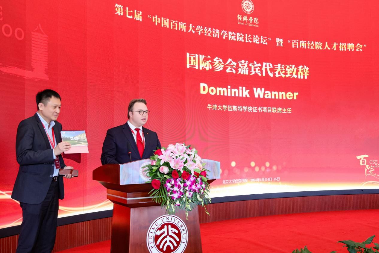 为深入学习贯彻落实党的二十届三中全会精神,北京大学经济学院于2024年12月14日在经济学院603学术报告厅举办第七届“中国百所大学经济学院院长论坛”暨“百所经院人才招聘会”。本次论坛着眼“以进一步全面深化改革推动经济高质量发展”,深入探索推动中国经济高质量发展的体制机制改革,加快建构中国自主的经济学知识体系,为全面推进强国建设、民族复兴伟业提供学术支持。论坛由开幕式、第二届“孙尚清发展知识研究与交流奖”颁奖仪式、荣誉教授授予仪式、国际参会嘉宾代表致辞、捐赠仪式、圆桌论坛、平行分论坛、百所经院人才招聘会等环节组成,并新增设北京大学2024“学科质量年”博士生论坛暨“中国经济学博士生论坛”。来自全国206所院校的36位校长和229位院长出席本次论坛,开幕式由北京大学经济学院学术委员会主席、副院长张辉主持。