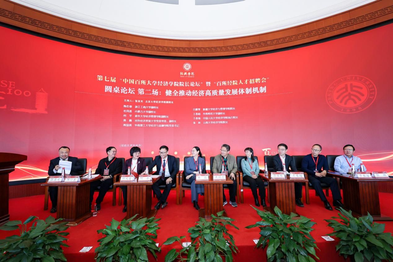 “健全推动经济高质量发展体制机制”圆桌论坛由北京大学经济学院副院长张亚光主持。浙江工商大学副校长陈衍泰,内蒙古大学副校长杜凤莲,清华大学经济管理学院副院长何平,对外经济贸易大学党委常委、副校长黄薇,华南理工大学经济与金融学院党委书记黄国清,新疆大学经济与管理学院院长吕雁琴,华南师范大学副校长王春超,中国人民大学经济学院执行院长于春海,云南大学经济学院院长张林等嘉宾进行了充分交流。