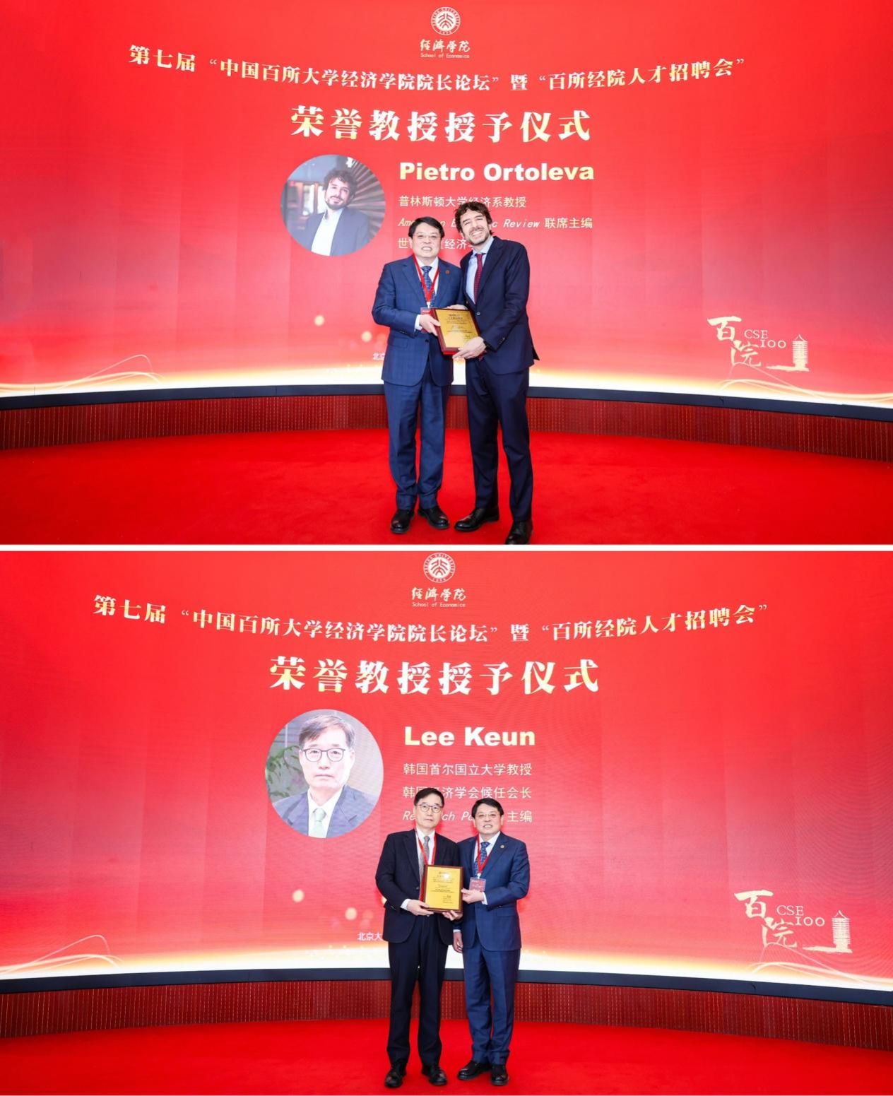 董志勇向普林斯顿大学经济系教授、《美国经济评论》(American Economic Review)联席主编、世界计量经济学会会士彼得罗•奥尔托列瓦(Pietro Ortoleva),韩国首尔国立大学教授、韩国经济学会候任会长、《研究政策》(Research Policy)主编李根(Lee Keun)授予荣誉教授证书。