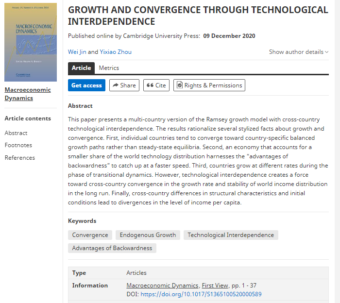 研究意义: 高度全球化的世界经济显示出各个国家技术相互依存的总体趋势。在技术相互依赖的世界经济中,单个国家的技术进步和经济增长不仅是其自身基本面的直接结果,而且也取决于所有其他技术依存国家的经济技术特征。为描述这一客观现实,本研究基于拉姆齐框架构建了一个刻画跨国技术依赖的多国经济增长模型。在该框架中,世界技术进步取决于所有技术依存国家的创新,而不是单个前沿国家的技术变化。采用这一全新分析框架,本研究从理论解析,数值模拟和实证检验多个角度考察了在技术相互依存情况下的经济增长和趋同,并解释了一系列增长趋同的特征事实。相比于单个技术前沿国家的单向技术扩散模型(如Nelson & Phelps, 1966; Parente & Prescott, 1994; Chu et al., 2014; Stokey, 2015),本文所提出的技术依存多国增长模型能够更好解释全球化背景下增长与趋同的现实特征。