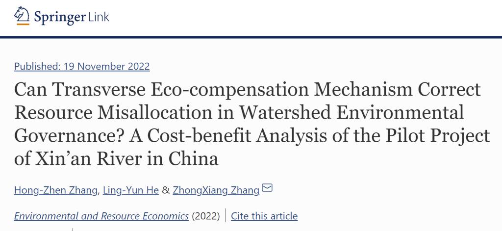河北大学管理学院讲师张洪振博士、暨南大学经济学院何凌云教授与天津大学马寅初经济学院创院院长、卓越教授,国家能源、环境和产业经济研究院院长张中祥合作的文章“Can Transverse Eco-compensation Mechanism Correct Resource Misallocation in Watershed Environmental Governance? ACost-benefit Analysis of the Pilot Project of Xin’an River in China”在Springer出版社出版的期刊Environmental and Resource Economics在线发表。