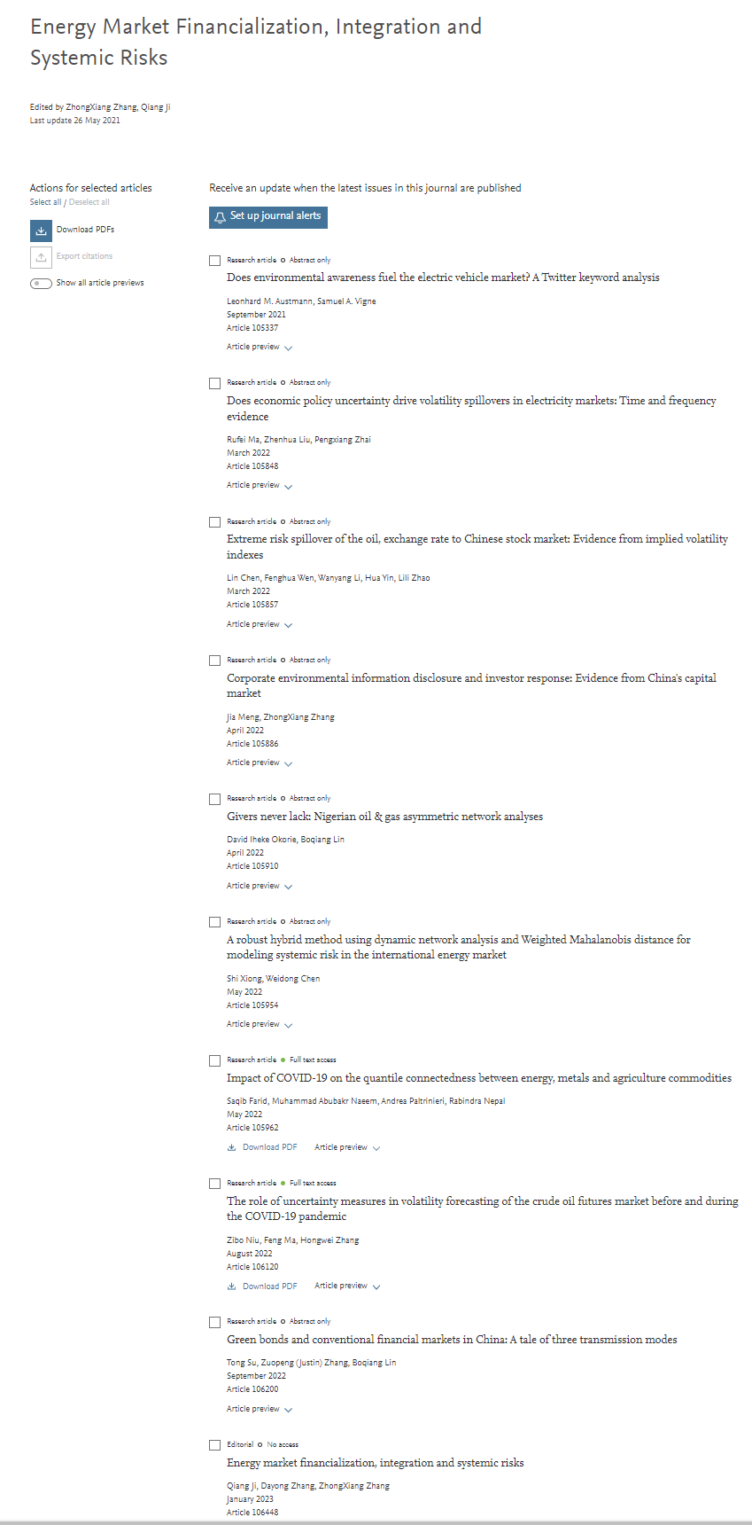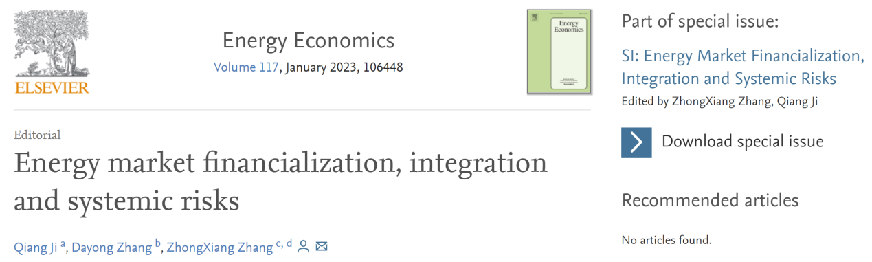随着与国家优青、中国科学院战略院姬强研究员,国家社科重大项目首席专家、西南财经大学张大永教授撰写的编者按正式发表,天津大学马寅初经济学院创院院长、卓越教授,国家能源、环境和产业经济研究院院长张中祥担任共同客座主编、以Energy Market Financialization, Integration and Systemic Risks为主题的Energy Economics专刊正式出版。这是张中祥作为客座主编从2004年起先后为Energy Policy (2004),International Environmental Agreements: Politics、Law and Economics (2007, 2010),Journal of Policy Modeling (2009),Energy Economics (2010),International Economics and Economic Policy (2010),SAPIENS(2011),Mineral Economics (2012), Energy & Environment(2013),Environmental Economics and Policy Studies (2015年北洋大学-天津大学120周年校庆纪念专刊), Climate Policy (2015)和Journal of Environmental Management(2020)等国际学术期刊主编专刊之后,主编的第十三本专刊。据2021年JCR影响因子报告,Energy Economics的影响因子为9.252,位列SSCI经济学学科类380种期刊第9位。