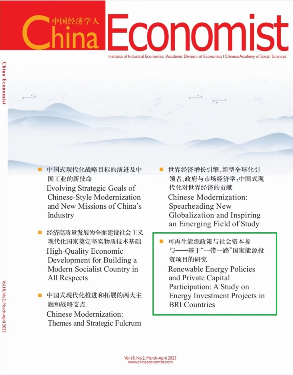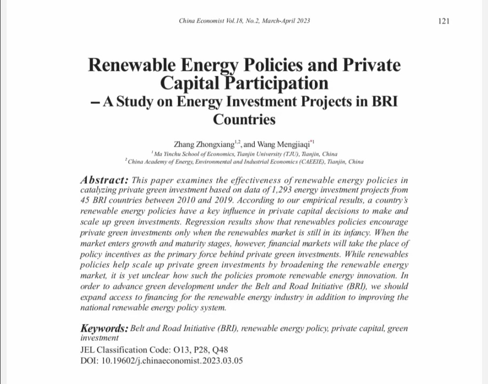天津大学马寅初经济学院创院院长、卓越教授张中祥和指导的2020级硕士研究生王梦佳奇的合作论文“可再生能源政策与社会资本参与——基于“一带一路”国家能源投资项目数据的研究”在中国社会科学院主管主办的《中国经济学人》(China Economist)正式发表,刊登在2023年4月出版的该刊第18卷、第2期上。这期是中英文双语刊,文章的中、英文版同时刊出。
