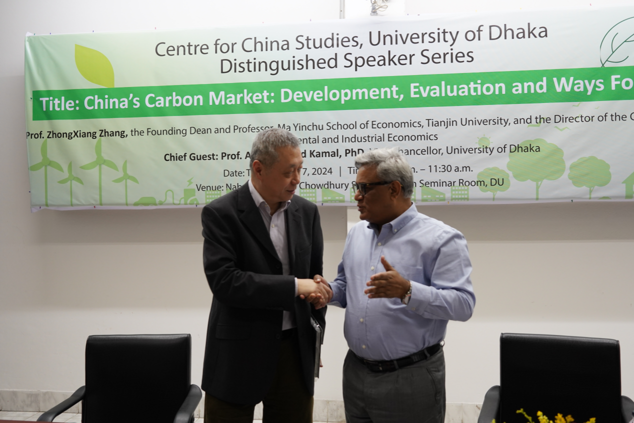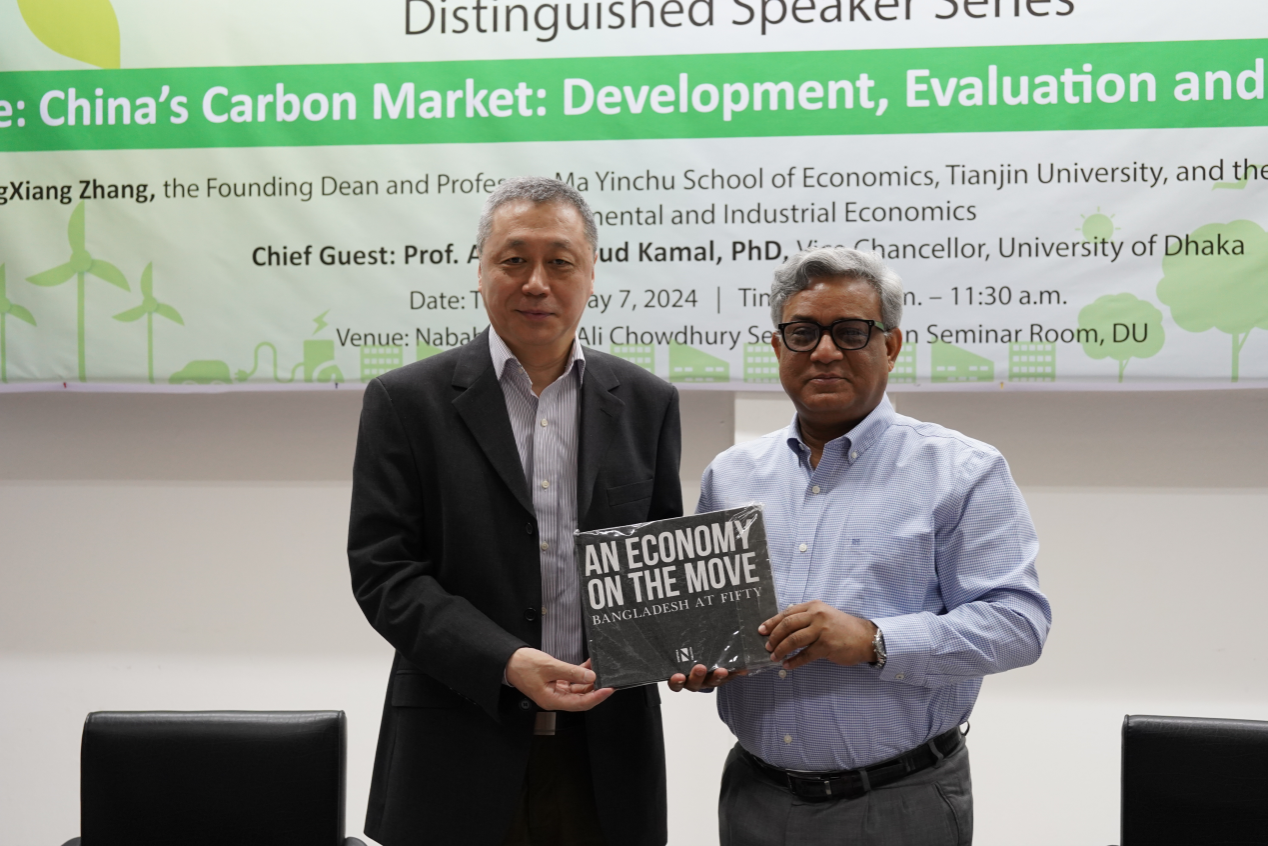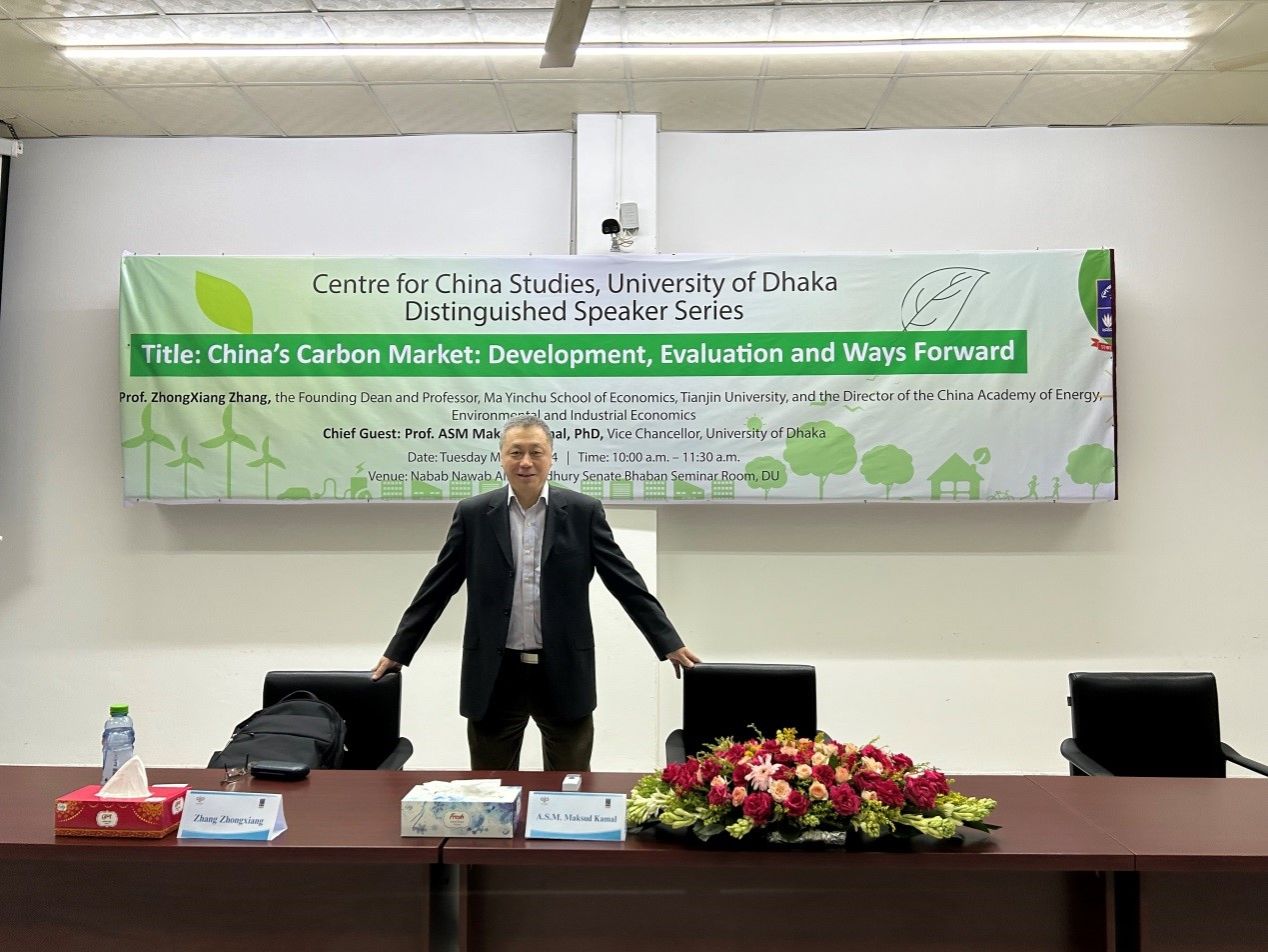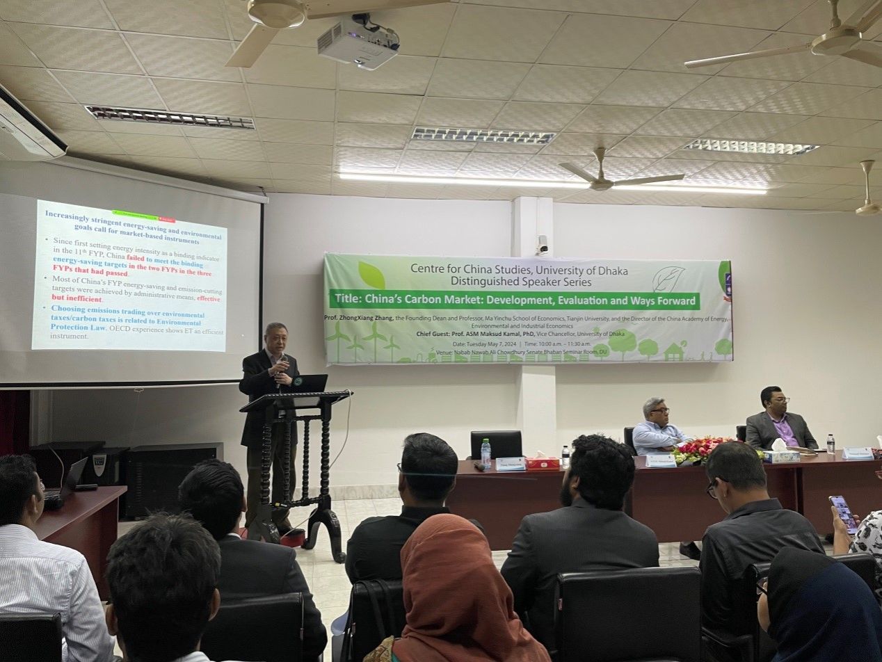 2024年5月7日,天津大学卓越教授、马寅初经济学院创院院长,国家能源、环境和产业经济研究院院长张中祥应邀在达卡大学杰出演讲者系列作了题为“中国国家碳市场:发展、评估和前景”的专题讲座。达卡大学校长Maksud Kamal教授出席讲座并做了点评、赠送介绍孟加拉国独立50年来经济发展的精美画册,达卡大学国际事务办公室主任、中国研究中心(孟加拉国)孟方主任Shamsad Mortuza教授主持报告会,来自达卡大学的100多位师生现场参会并进行积极互动。