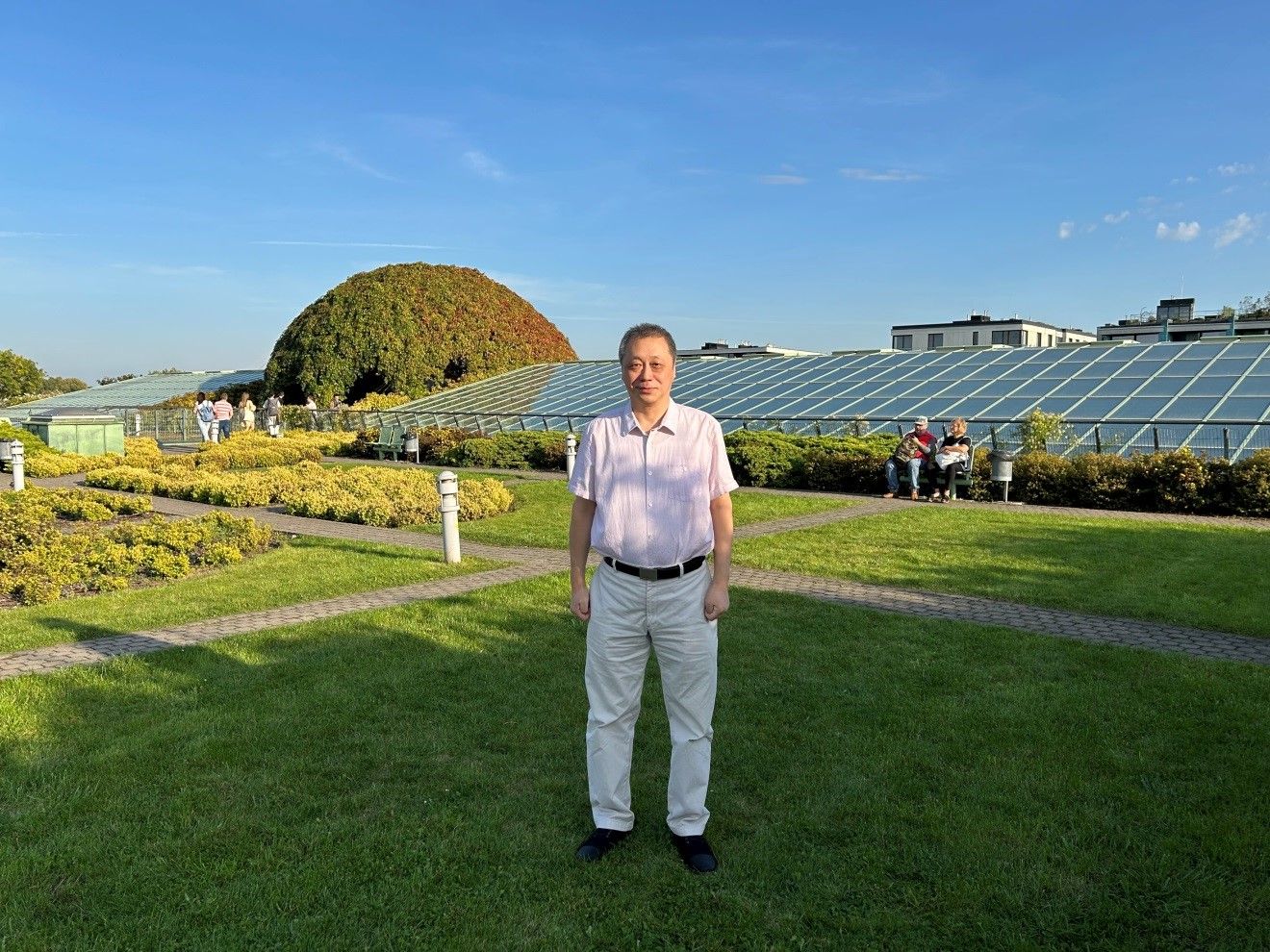 (摄于华沙大学新图书馆屋顶。屋顶上提供了一片宁静的绿洲,并通过一条带有级联水的溪流与较下部连接,是欧洲最大、环境最好的屋顶花园。)