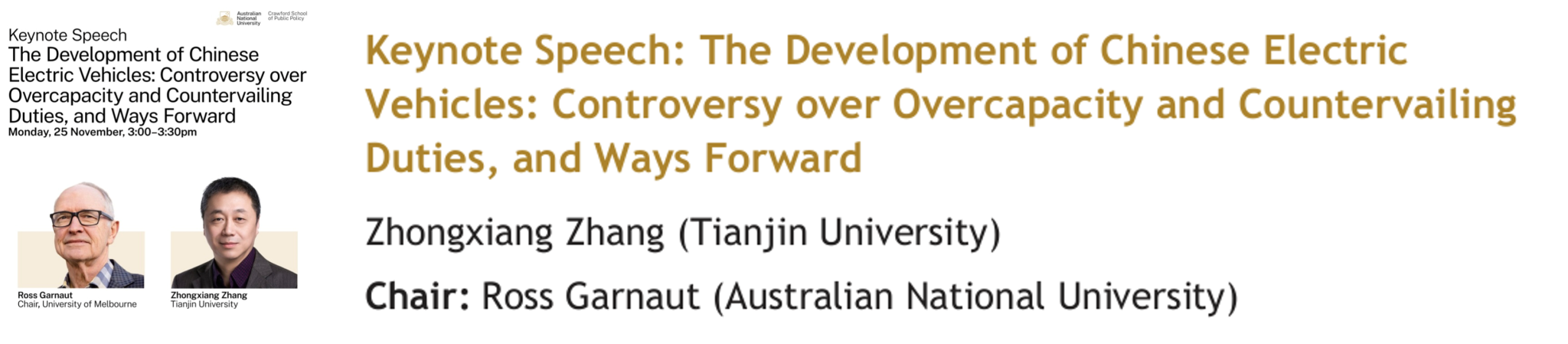 天津大学卓越教授、马寅初经济学院创院院长,国家能源、环境和产业经济研究院院长张中祥应邀将在澳大利亚国立大学克劳福德公共政策学院举行的中国China Update 2024(2024中国经济前沿)上以“The Development of Chinese Electric Vehicles: Controversy over Overcapacity and Countervailing Duties,and Ways Forward”为题做主旨报告,主旨报告由澳大利亚国立大学杰出教授、澳大利亚原驻中国大使Ross Garnaut博士主持。