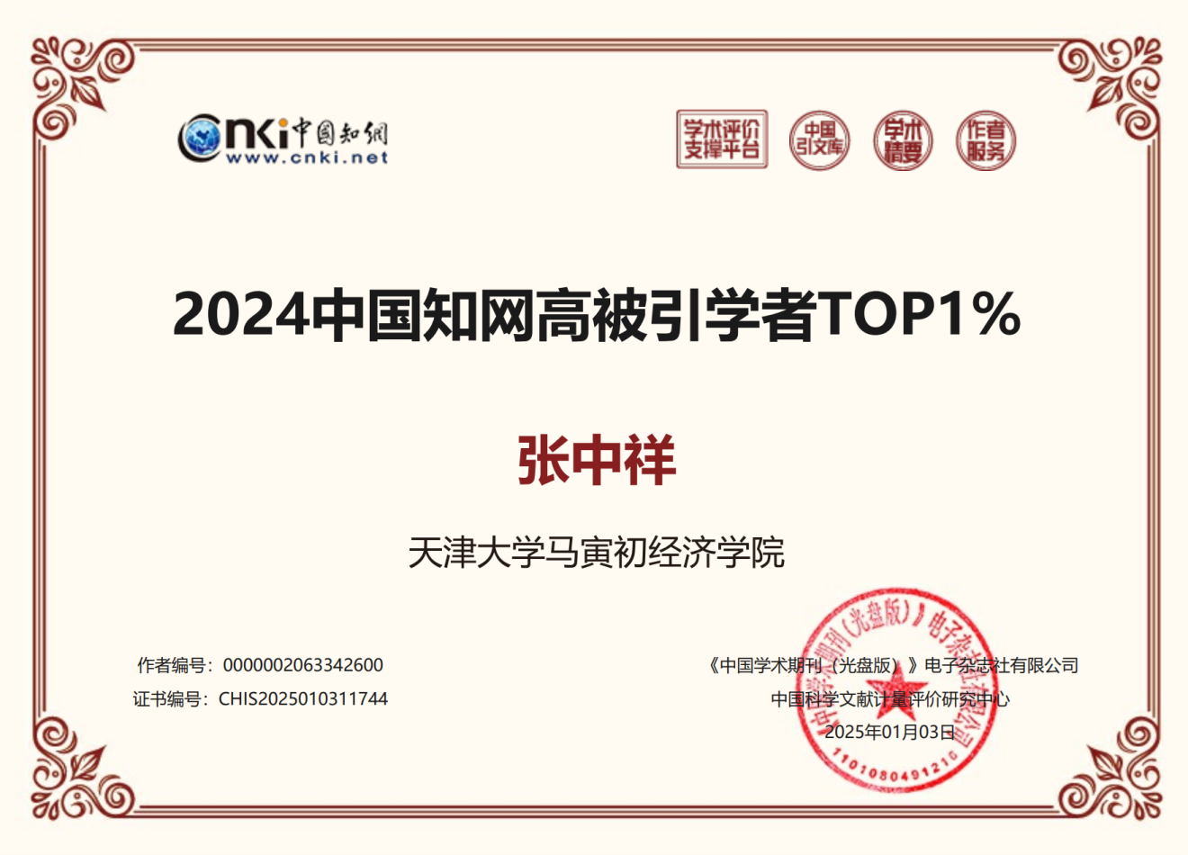 天津大学卓越教授、马寅初经济学院创院院长,国家能源、环境和产业经济研究院院长张中祥入选应用经济学科“2024中国知网高被引学者Top1%”名单。