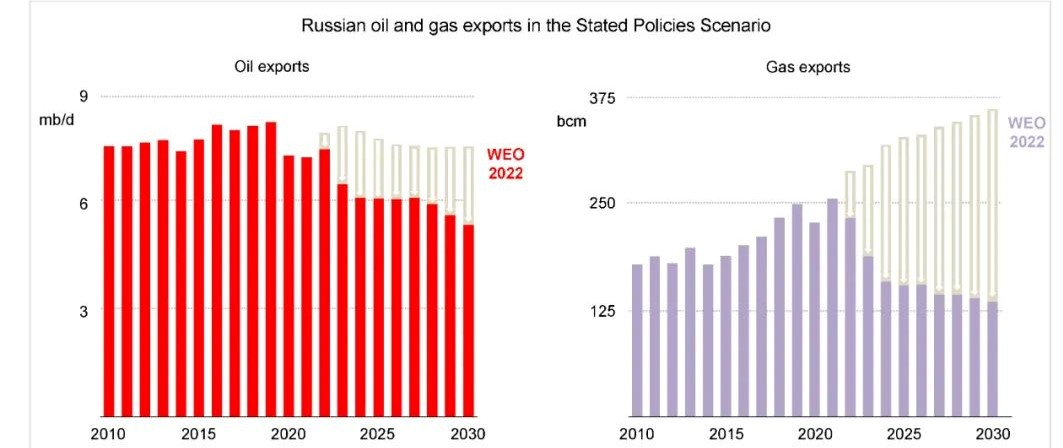 (《2022世界能源展望》既定政策情景(STEPS)下2030年俄罗斯石油(左图,红色)和天然气(右图,紫色)出口预测)