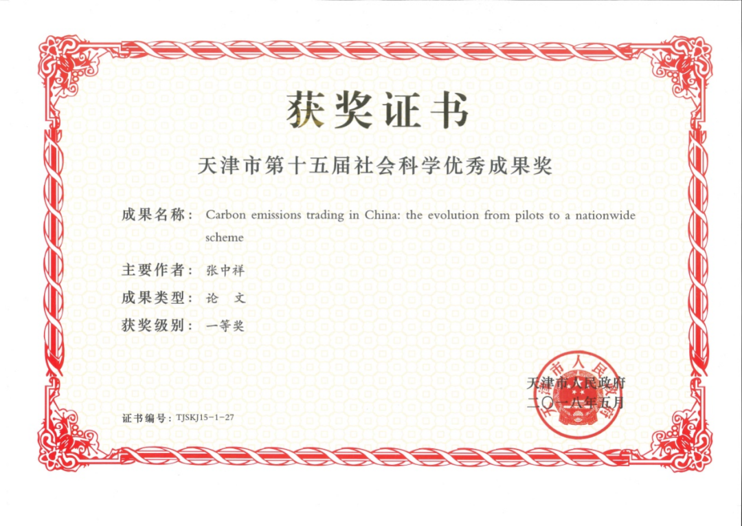 2015年张中祥发表的“Carbon Emissions Trading in China: The Evolution from Pilots to a Nationwide Scheme”(中国碳排放交易:从地区试点向全国体系演变)的文章入选位居SSCI公共管理类期刊首位的Climate Policy办刊20年20篇优秀文章“Top 20 papers for 20 years”,之前该文也荣获两年一次的天津市社会科学优秀成果一等奖。