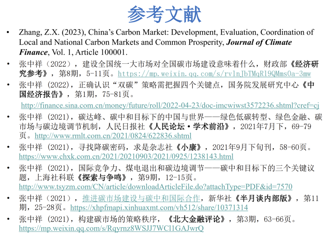 张中祥从上世纪90年代在荷兰格罗宁根大学法学院和经济学院任职时起就呼吁在全球实施碳排放交易这一市场机制。早在1998年,他就与美国环境和资源经济学家协会理事长TomTietenberg教授等欧美学者应邀为联合国贸发会议(UNCTAD)撰写、1999年由联合国正式出版的《温室气体排放交易国际规则》的报告,1998年美国未来资源研究所(RFF)曾以EmissionsTrading101对这个联合国报告做过报道;他在法学和经济学国际杂志JournalofWorldTrade上发表了全球该领域第一篇论述温室气体排放交易和世界贸易的论文;在美国东西方中心任职资深研究员时,张中祥应邀与包括已故PeterBohm(斯德哥尔摩大学经济学教授、1985年Elsevier出版的著名Handbook丛书作者),WallaceOates(美国国家科学院院士、世界顶级公共财政和环境经济学家)和DavidPearce(首位欧洲环境和资源经济学家学会终身成就奖获得者,为张中祥1997年由英国EdwardElgar出版、入选“环境经济学里程碑”丛书的英文独著的封面写了荐言)在内的其他5位欧美顶级经济学家对欧盟碳排放交易体系提出改进建议。
