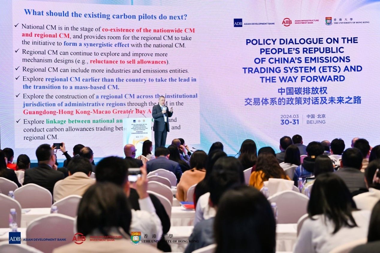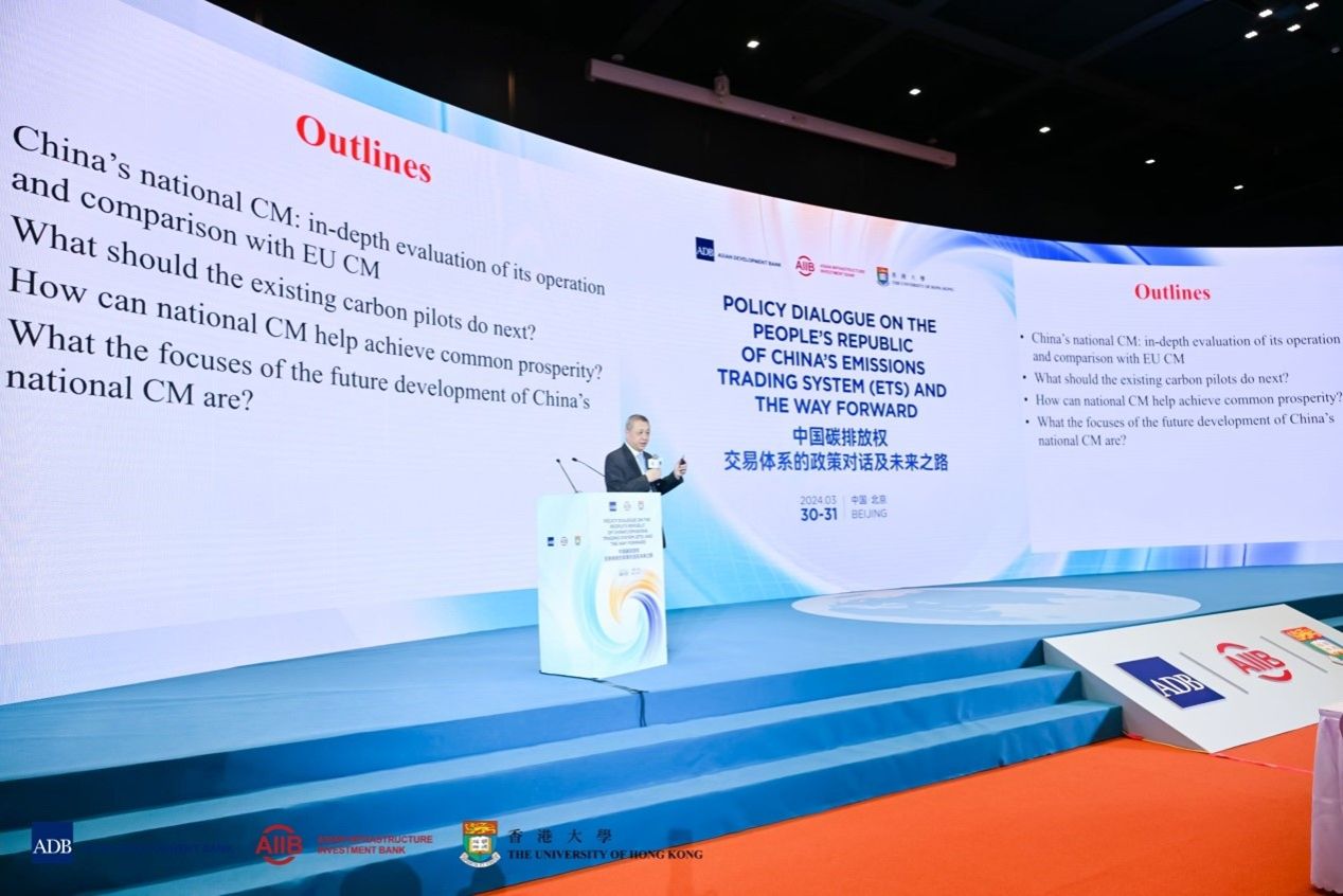 “中国碳排放权交易体系的政策对话及未来之路”论坛于2024年3月30-31日在北京。论坛由亚洲开发银行、亚洲基础设施投资银行、香港大学联合举办。亚洲开发银行首席经济学家兼经济研究和区域合作局局长Albert Park、亚洲基础设施投资银行首席经济学家Erik Berglof、香港大学经济及工商管理学院院长蔡洪滨分别代表主办方致开幕词。