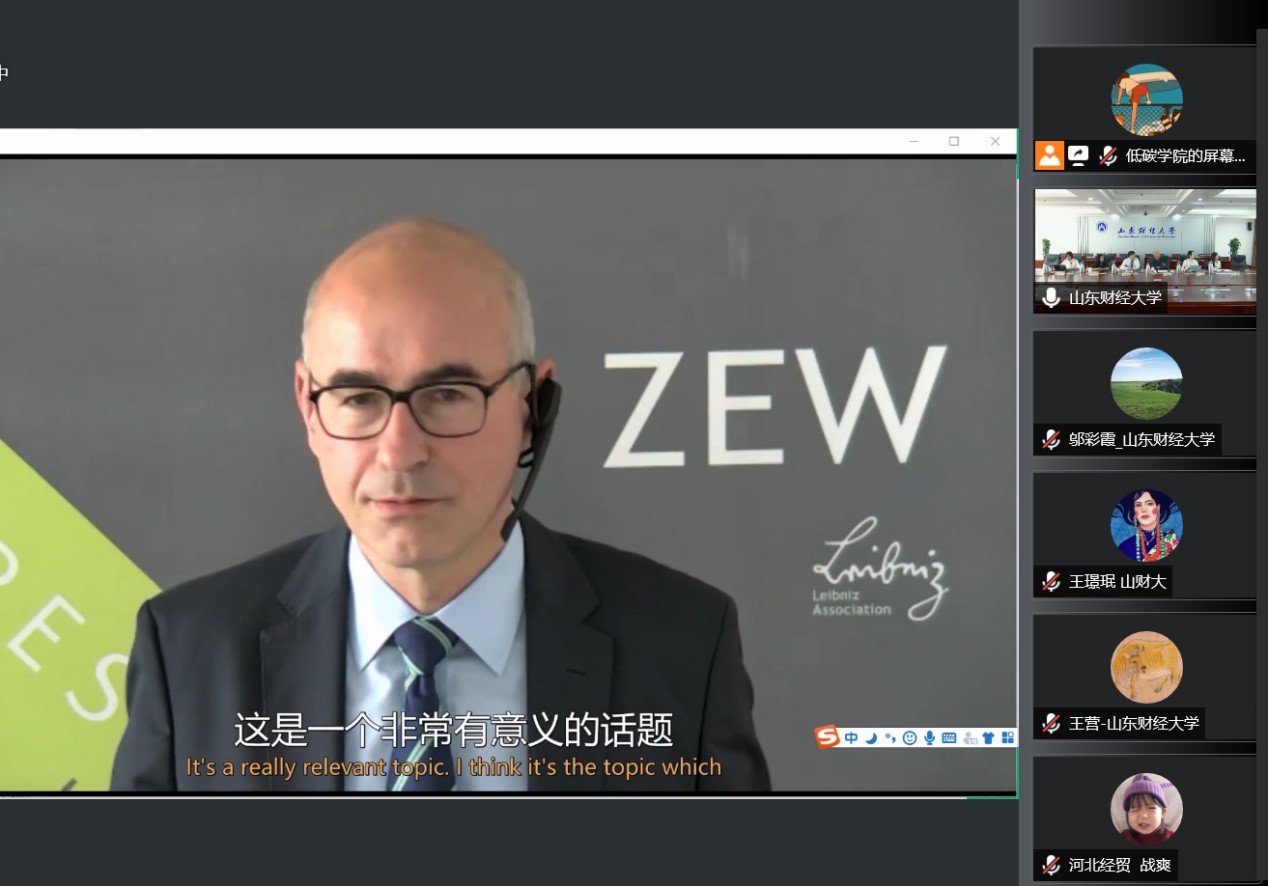 嘉宾致辞后,欧洲经济研究院院长阿希姆·瓦姆巴赫,日本名古屋大学教授薛进军,上奥地利应用科学技术大学教授安德里亚斯·泽特纳,天津大学马寅初经济学院创院院长张中祥,德国马丁路德·哈勒维滕贝格大学教授柔斯特,山东财经大学国际经贸学院副教授邬彩霞,德国马丁路德·哈勒维滕贝格大学教授卜玉洗进行演讲。与会嘉宾就全球气候变化、低碳发展和产业升级等相关议题展开讨论,在欧洲气候政策、绿色全球价值链与碳中和、全球价值链升级对职业教育的影响、中国低碳经济发展的协同效应研究等领域进行深入研讨。