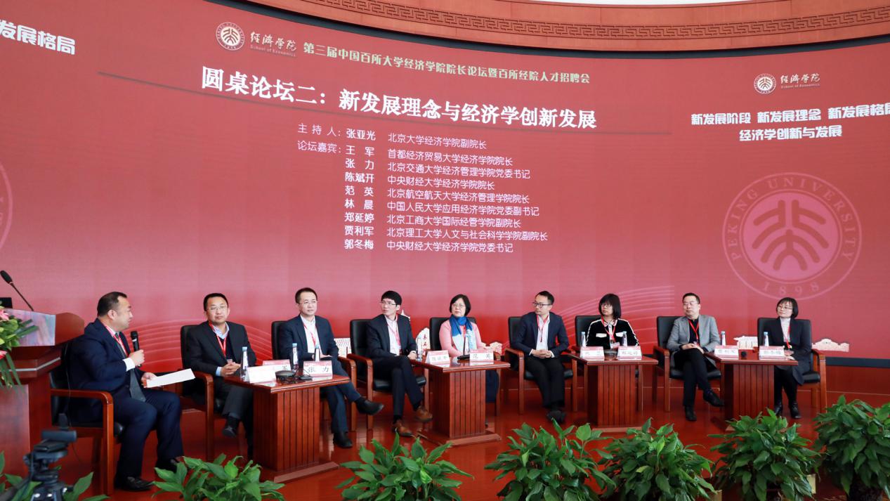 “新发展理念与经济学创新发展”圆桌论坛由北京大学经济学院副院长张亚光主持。首都经济贸易大学经济学院院长王军、北京交通大学经济管理学院党委书记张力、中央财经大学经济学院院长陈斌开、北京航空航天大学经济管理学院院长范英、中国人民大学应用经济学院党委副书记林晨、北京工商大学国际经管学院副院长郑延婷、北京理工大学人文与社会科学学院副院长贾利军和中央财经大学经济学院党委书记郭冬梅等嘉宾围绕主题进行了富有建设性的探讨。