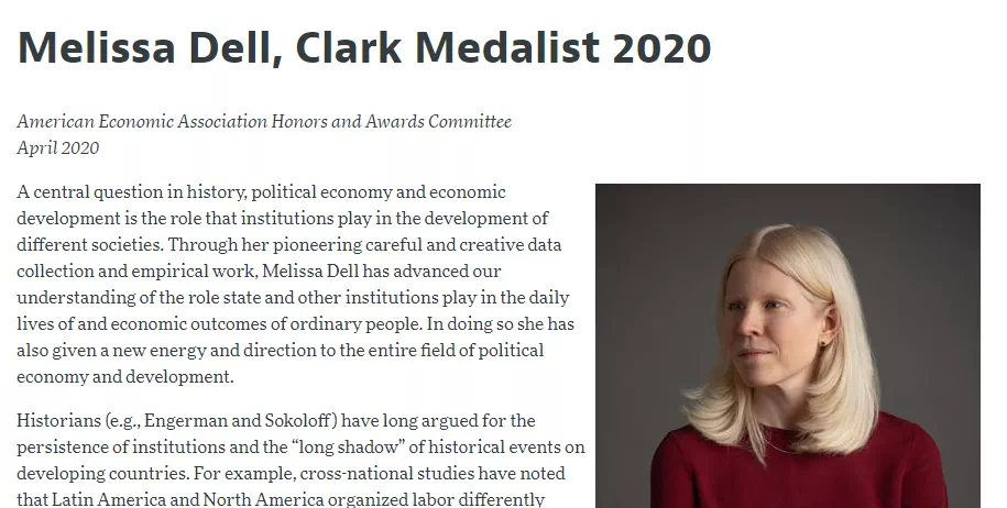 近日,2020年的克拉克奖颁给了哈佛大学经济系教授梅丽莎·戴尔(Melissa Dell),以表彰她在经济史、政治经济学、制度经济学、发展经济学领域的杰出工作。AEA官方发布的获奖公告称:“通过细致而富有创造性的数据收集和经验研究,Dell增进了我们对国家和其他机构在普通人的日常生活和经济后果中所扮演角色的理解。”
