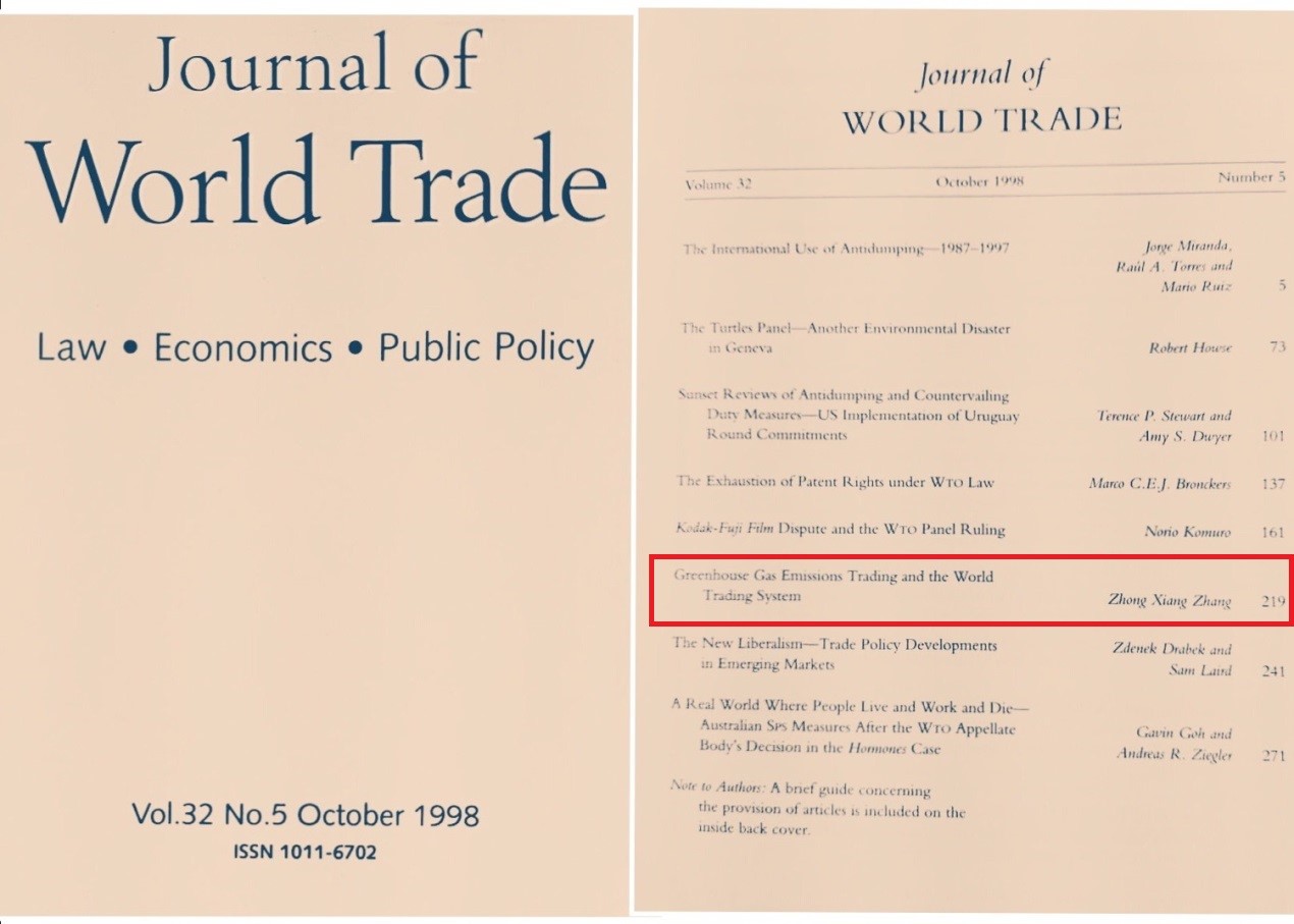 张中祥院长从上世纪90年代在荷兰格罗宁根大学法学院和经济学院任职时起就呼吁在全球实施碳排放交易这一市场机制。早在1998年,他就与美国环境和资源经济学家协会理事长Tom Tietenberg教授等欧美学者应邀为联合国贸发会议(UNCTAD)撰写、1999年由联合国正式出版的《温室气体排放交易国际规则》的报告,1998年美国未来资源研究所(RFF)曾以Emissions Trading101对这个联合国报告做过报道;他在法学和经济学国际杂志Journal of World Trade上发表了全球该领域第一篇论述温室气体排放交易和世界贸易的论文;在美国东西方中心任职资深研究员时,张中祥应邀与包括已故Peter Bohm(斯德哥尔摩大学经济学教授、1985年Elsevier出版的著名Hand book丛书作者),Wallace Oates(美国国家科学院院士、世界顶级公共财政和环境经济学家)和David Pearce(首位欧洲环境和资源经济学家学会终身成就奖获得者,为张中祥1997年由英国Edward Elgar出版、入选“环境经济学里程碑”丛书的英文独著的封面写了荐言)在内的其他5位欧美顶级经济学家对欧盟碳排放交易体系提出改进建议。2015年张中祥发表的“Carbon Emissions Trading in China:The Evolution from Pilotstoa Nationwide Scheme”(中国碳排放交易:从地区试点向全国体系演变)的文章入选位居SSCI公共管理类期刊首位的Climate Policy办刊20年20篇优秀文章“Top 20 papers for 20years”,之前该文也荣获两年一次的天津市社会科学优秀成果一等奖。90年代在联合国贸发会议秘书处组织开展碳排放交易研究和推广的高级官员Frank Joshua曾在媒体公开留言,很高兴看到经过张教授等领域开拓者当年和之后持续不断的呼吁和努力,碳排放交易这一市场机制被世界上越来越多的国家和地区接受并付诸实施,在全世界创造了不计其数的工作机会和企业业务。