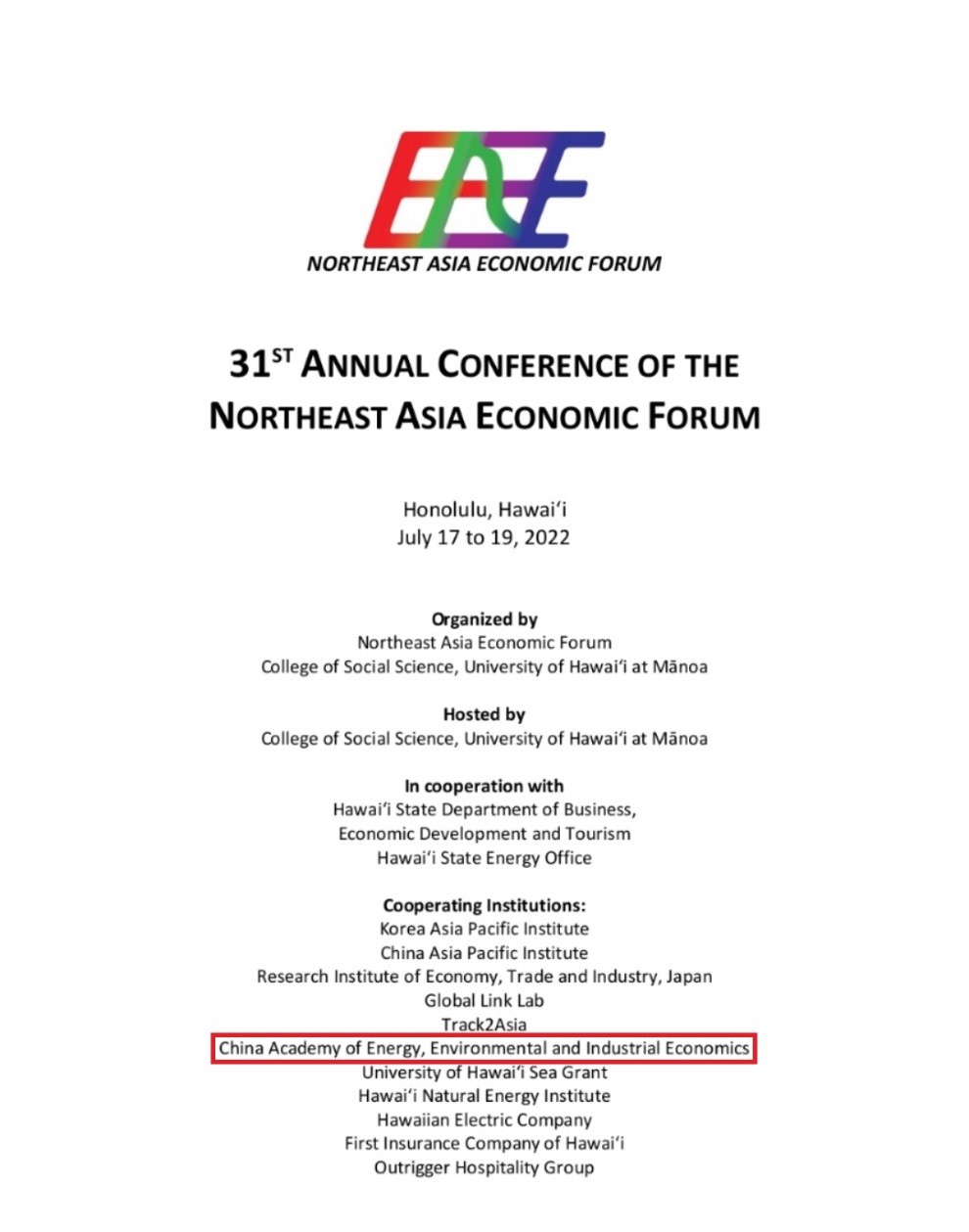 中宏网北京7月22日电 东北亚经济论坛第31届年会于2022年7月17-19日在美国夏威夷举行。年会由夏威夷大学社会科学学院和夏威夷大学社会科学学院主办,夏威夷州政府商务、经济发展与旅游局和夏威夷州政府能源办公室协办。国家能源、环境和产业经济研究院等为会议合作单位。开幕式由东北亚经济论坛主席、夏威夷大学社会科学学院院长Denise Konan教授主持,夏威夷州前州长John Waihe‘e,韩国国民议会前副议长Jae Hyong Hong致欢迎词。来自美国、日本、韩国和中国的前政府高级官员和资深专家在年会上应邀做了发言。