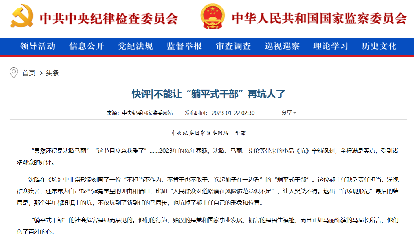 1月22日,中央纪委国家监委网站发表题为《不能让“躺平式干部”再坑人了》的快评称,“躺平式干部”的社会危害是显而易见的。他们的行为,贻误的是党和国家事业发展,损害的是民生福祉,而且正如马丽饰演的马局长所言,他们伤了百姓的心。