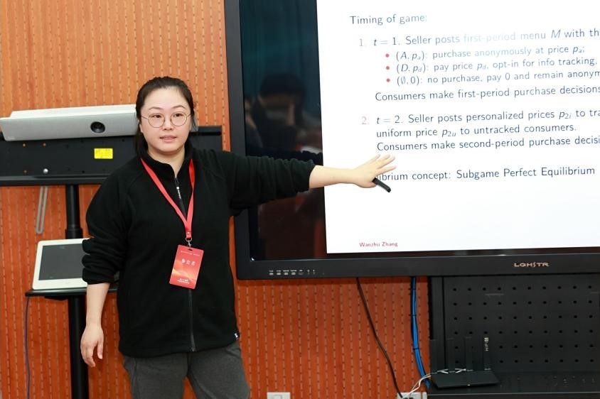 师资博士后张晚烛在微观理论与行为经济分会场报告了与对外经济贸易大学李建培教授的合作论文“The Value of Anonymous Option”。近年来个人数据保护法规通常要求卖家在收集与分析消费者信息之前获得消费者的明确同意。她们的研究通过在经典的买卖重复博弈模型中引入“匿名购买选择”,允许消费者在从卖家购买产品时保持匿名进而分析数据定价环境下匿名选择对博弈均衡的影响及其福利效应。尽管信息搜集与个性化定价意味着企业在消费者重复购买时可以最大程度的攫取消费者剩余,但卖家通过向消费者提供匿名选择会间接提高其市场承诺能力进而提高利润。这是因为卖家能够间接承诺对未识别的消费者设定较高的新客价格,从而避免消费者在早期策略性地延迟消费。而对消费者而言,其支付平均价格上涨,同时市场需求下降,消费者福利与市场总福利反而可能下降。因此,强制要求卖家提供匿名购买的选择但不辅以其他价格管制,实际上可能违背保护消费者利益的政策初衷。